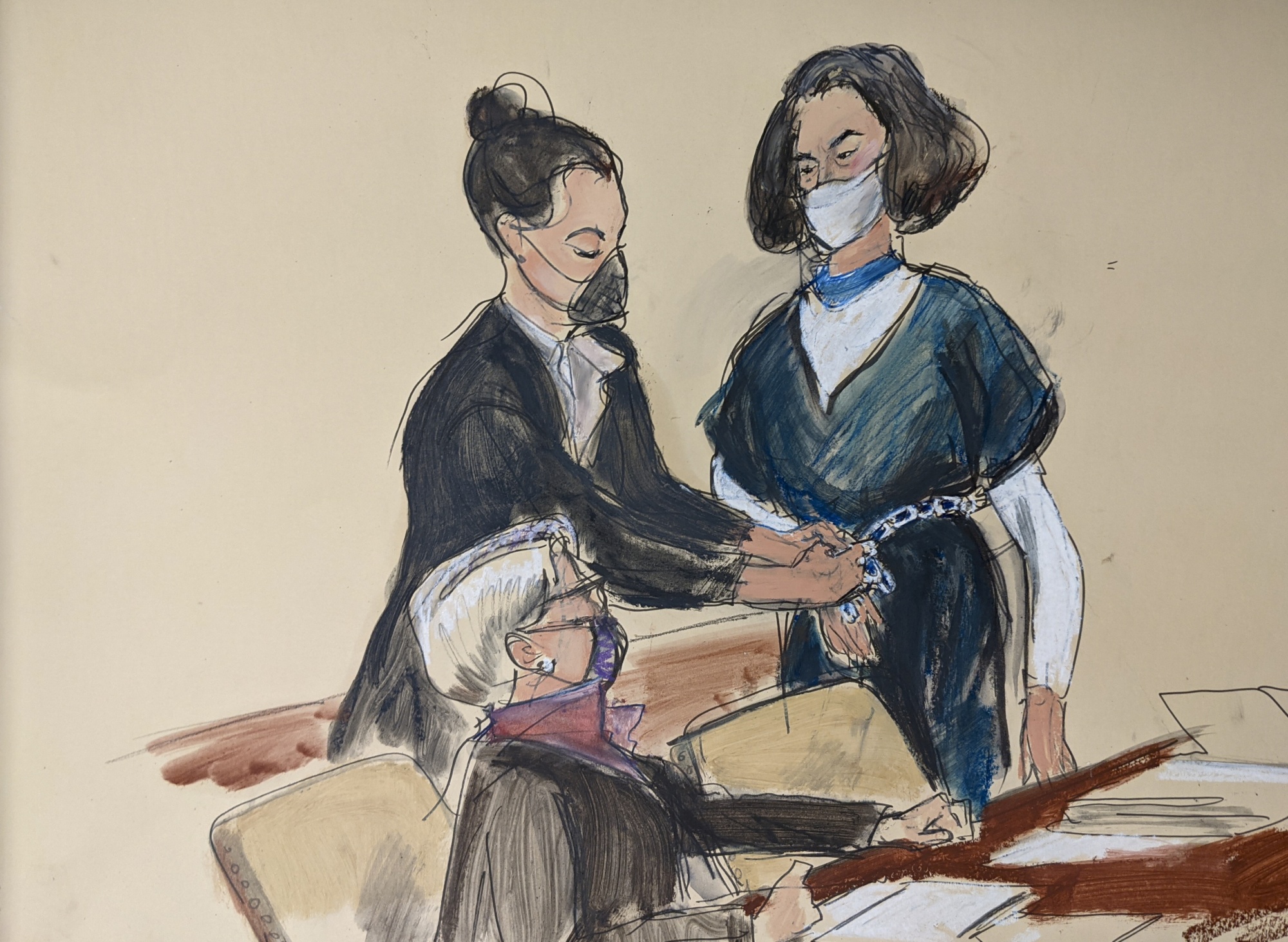 吉斯兰·麦克斯韦(Ghislaine Maxwell)在这张法庭素描中面对律师鲍比·斯特恩海姆(Bobbi Sternheim),美国法警正在解开她的脚镣,日期是11月1日。