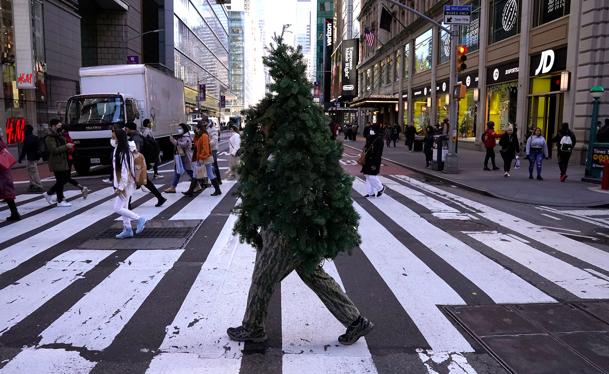 汤米·利贝托,也被称为来自马里兰州贝尔埃尔的“圣诞树先生”,在纽约市行走。