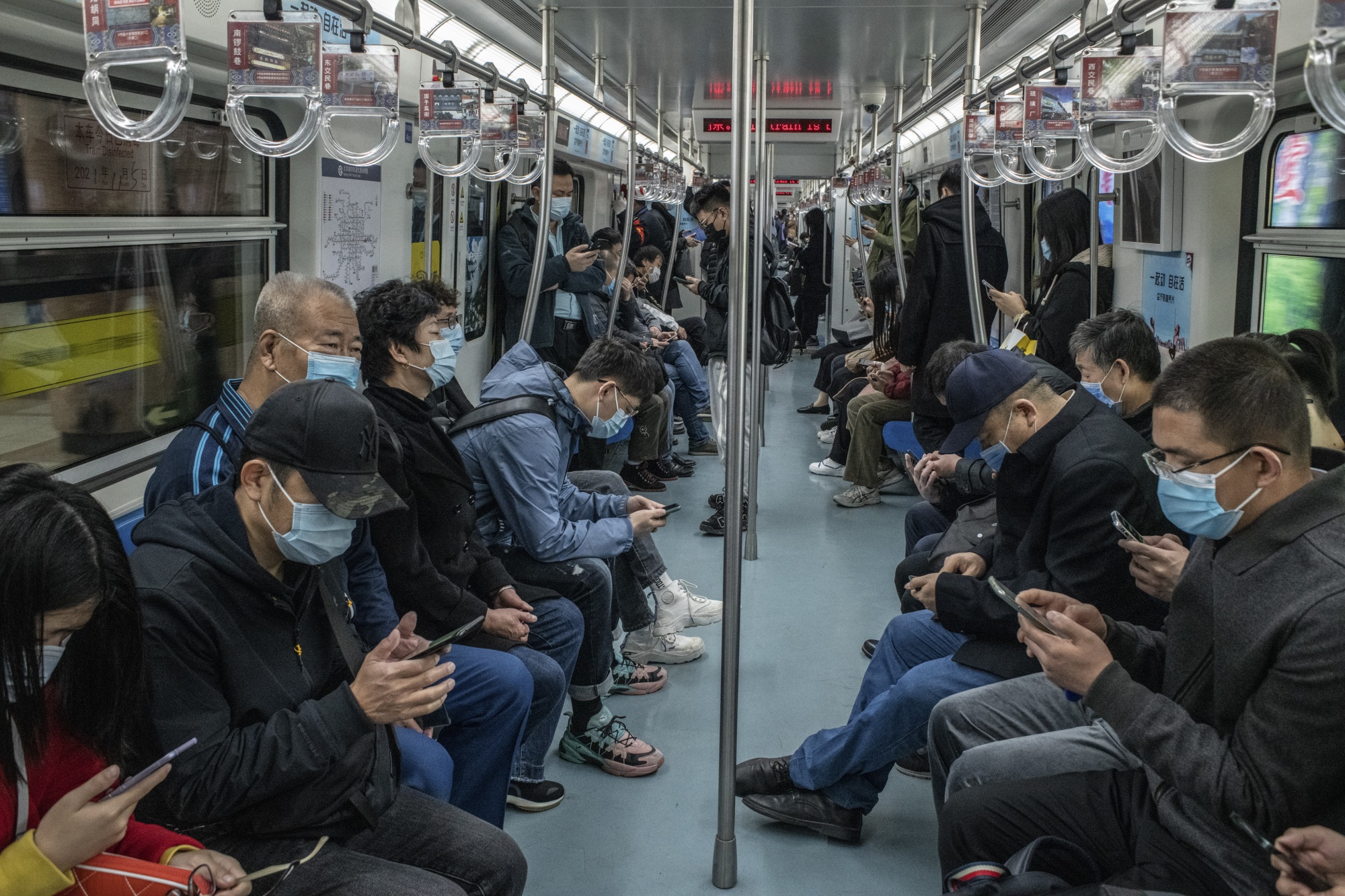 在北京地铁上戴着口罩的乘客,2021年11月。