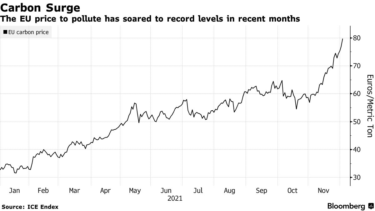 欧盟碳排放许可证价格上涨预计今年将超过100欧元/吨,据清洁能源转型的管理合伙人佩尔·莱坎德尔称。莱坎德尔是少数押注许可证将迅速上涨的投资者之一,因为欧盟利用市场来帮助实现本十年内的气候目标。与此同时,天然气价格飙升,推动公用事业公司燃烧更多煤炭,增加对碳排放许可证的需求。碳排放许可证昨日最高涨至每公吨79.87欧元,创下新纪录。