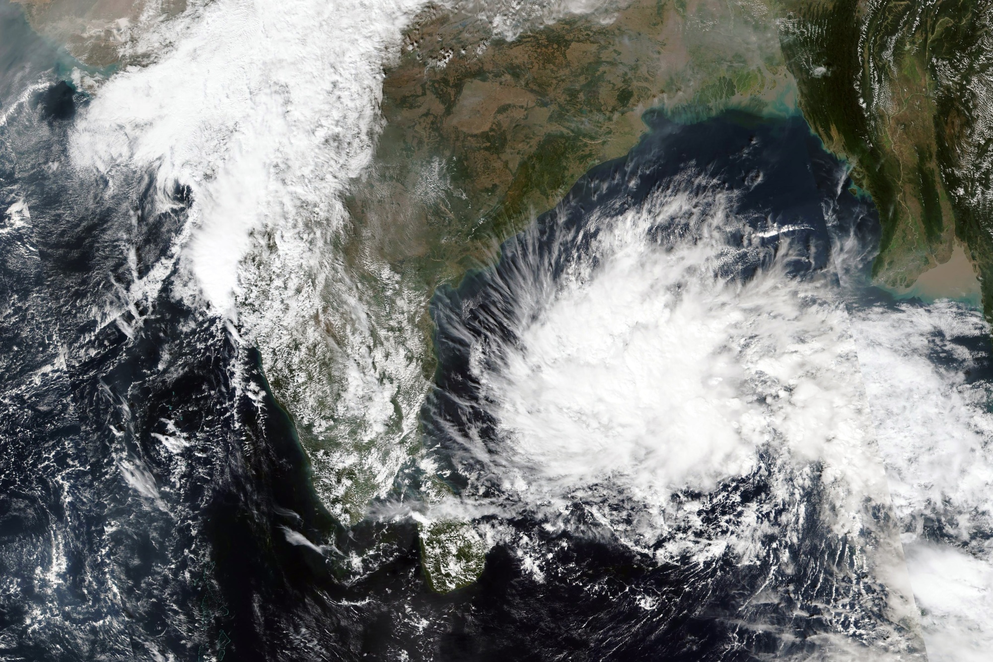 本周四,2021年12月2日,美国宇航局发布的卫星图像显示孟加拉湾正在酝酿一场风暴。印度当局于2021年12月3日星期五发布警报,在该国部分地区关闭学校并取消火车,救援队伍准备应对可能登陆的热带风暴。(美国宇航局世界观察,地球观测系统数据和信息系统(EOSDIS)通过美联社)