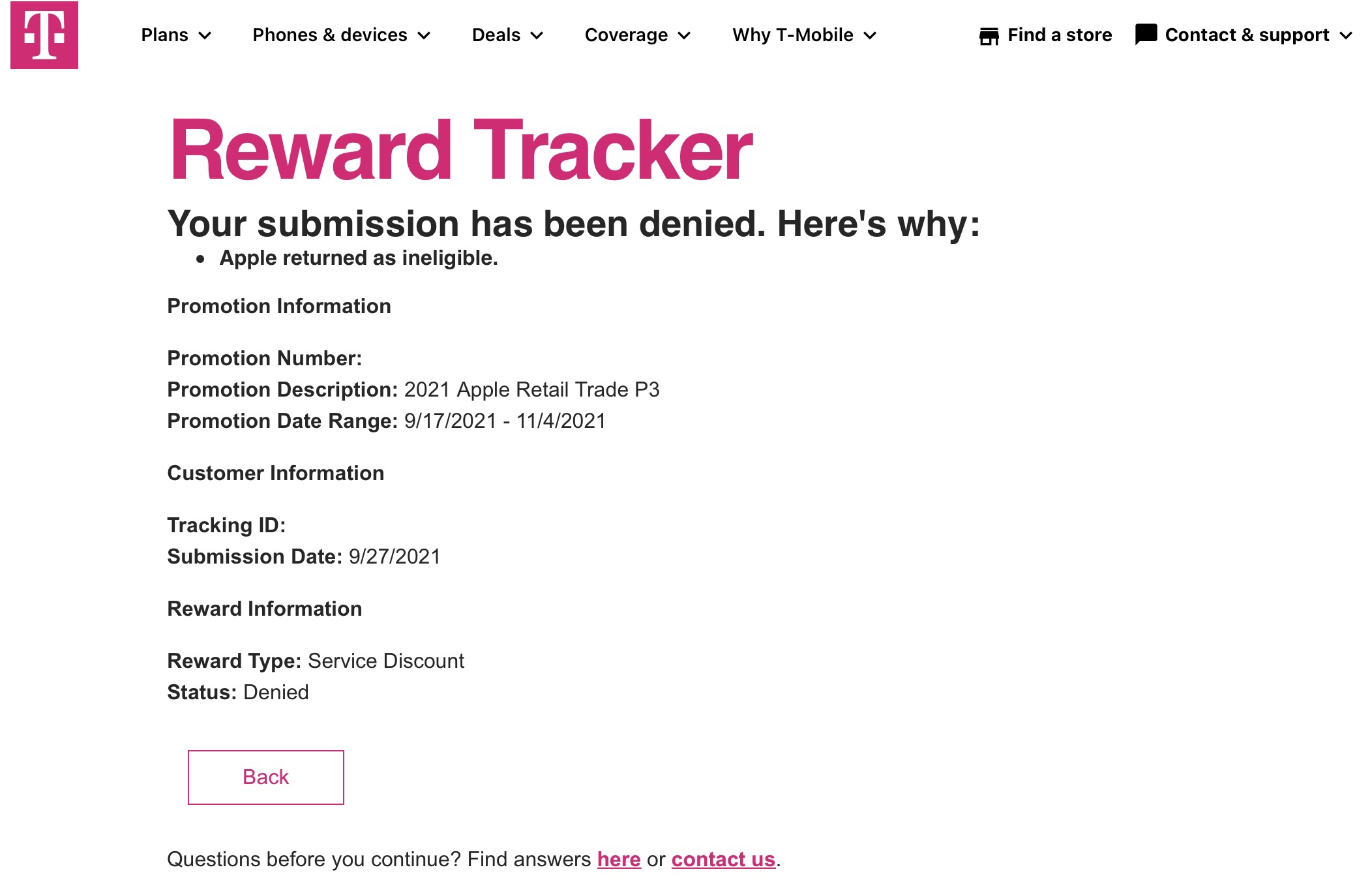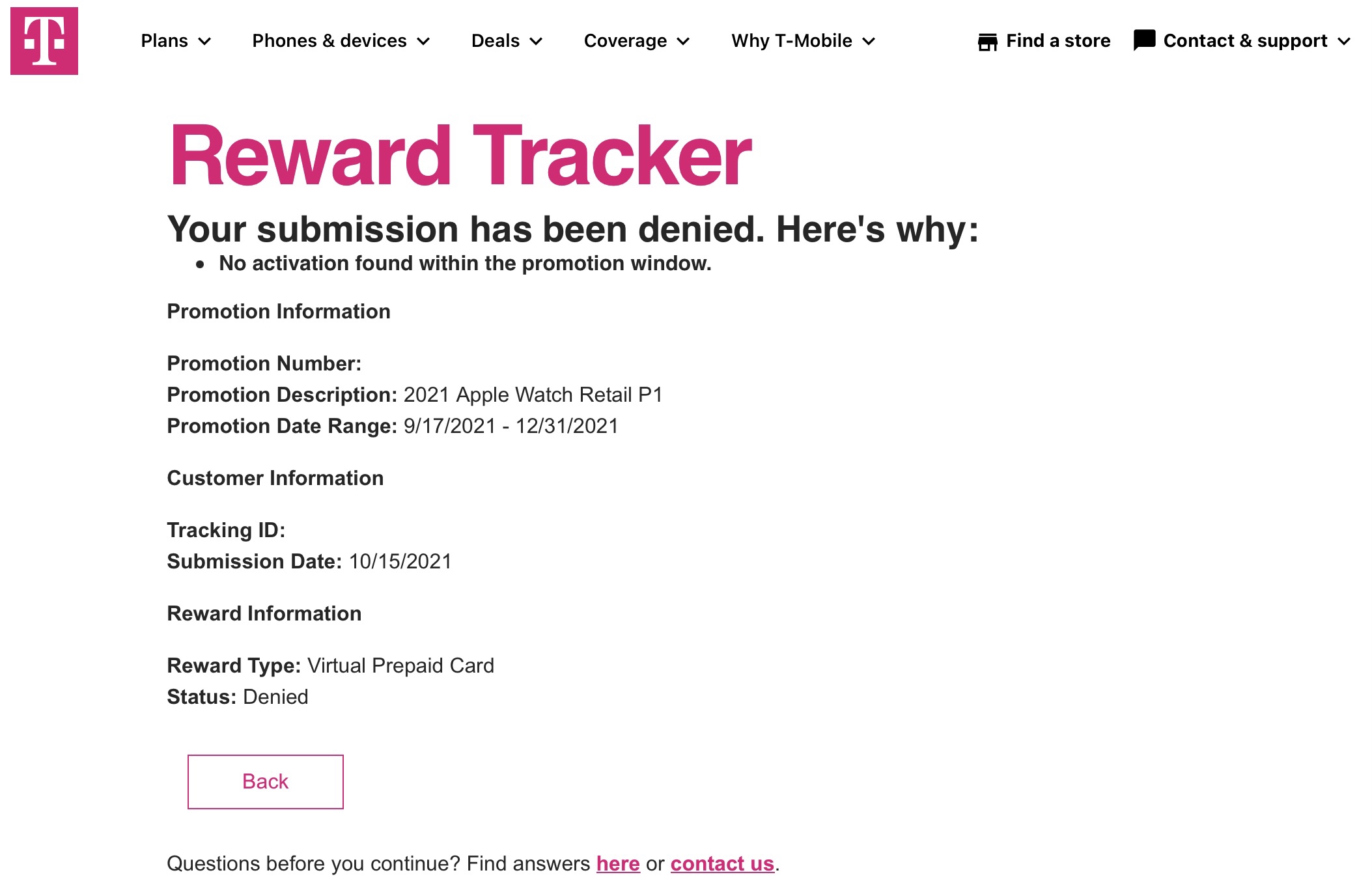 提交几周后,令我惊讶的是,T-Mobile 的促销网站显示我的索赔被拒绝,因为产品在促销期间未激活。当然,这是虚假的。