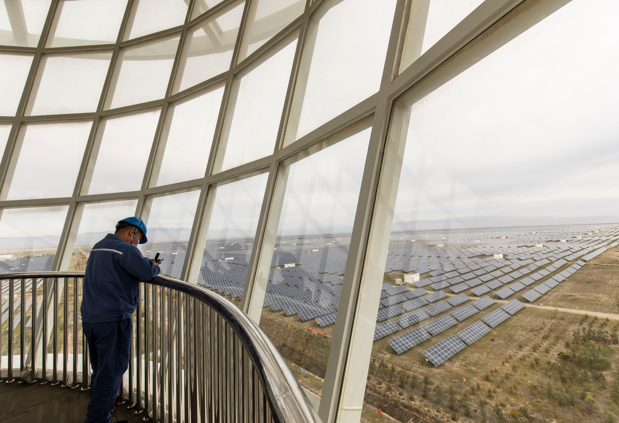 在九月下旬的一天,杨学力站在俯瞰龙羊峡大坝的地方,这是中国电网中发挥重要作用的水电站。天空中没有一丝云彩——青海是中国阳光最充足的省份之一——中午的阳光下水面呈现出绿色。附近就是一片片太阳能电池板,使这里成为世界上最大的光伏和水电综合设施的所在地。“水和光互补”,水电站副站长杨说。“当光线不稳定时,我们会用水电来调节。”