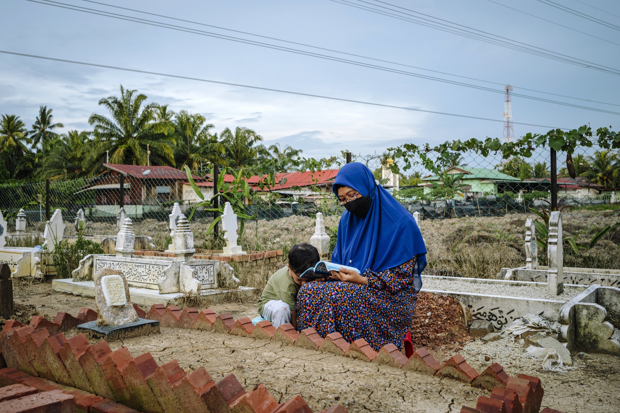 哈尼·宾·沙阿里的妻子和她最小的儿子在他的坟前。哈尼是STMicroelectronics位于麻坡的工厂中至少20名死于新冠肺炎的工人之一。摄影师:Ian Teh/Bloomberg