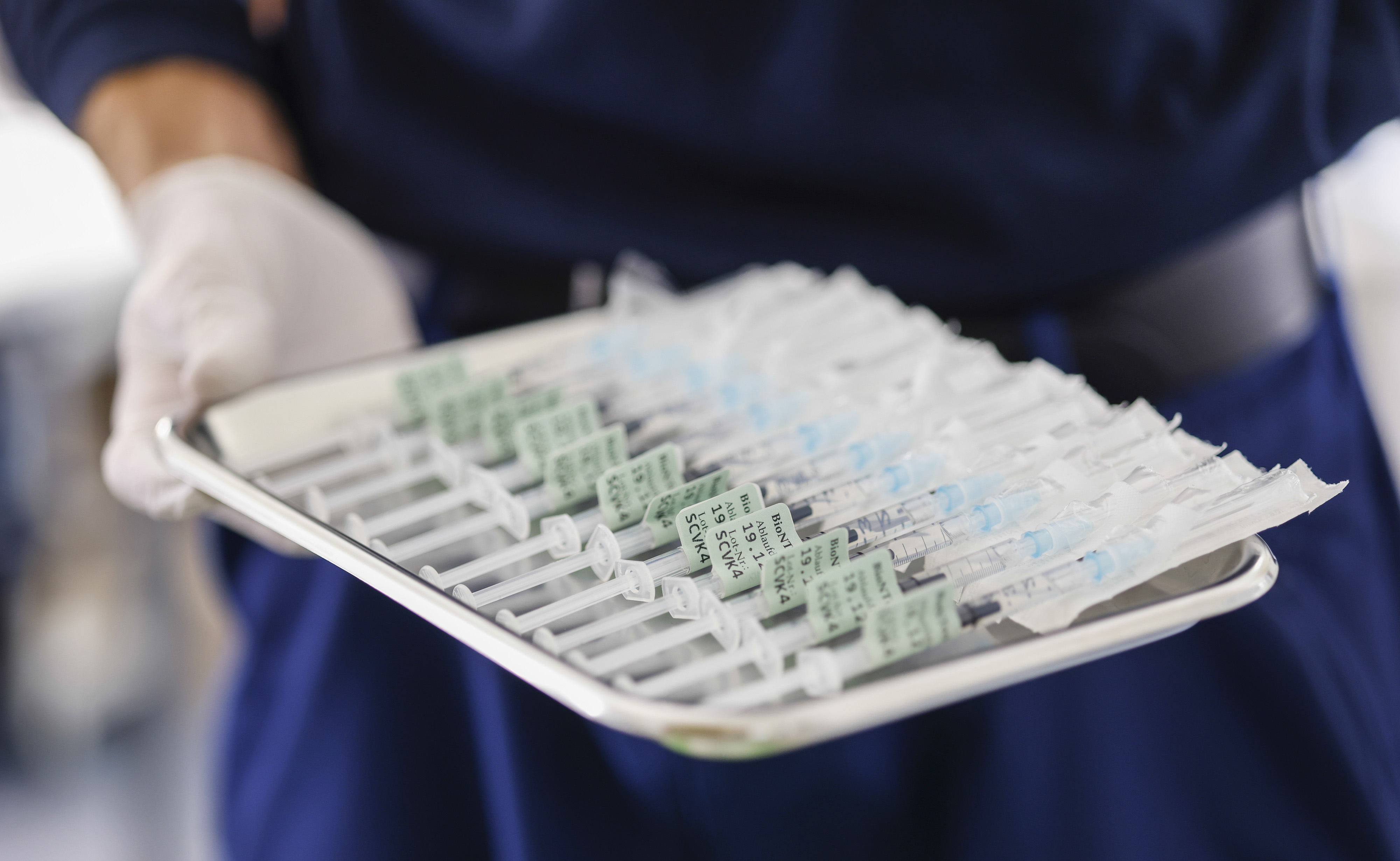 一名医护人员手持一托装有辉瑞-联德疫苗的注射器。