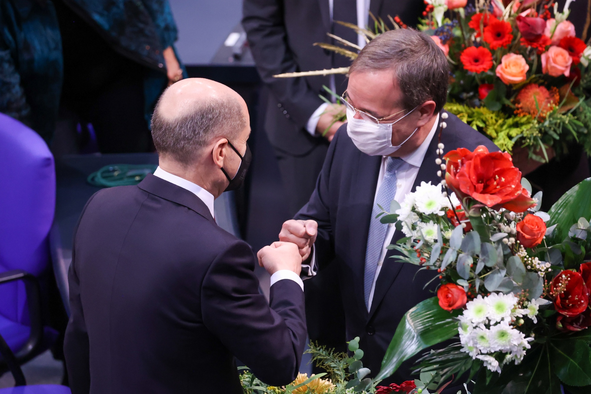基督教民主联盟领袖阿尔敏·拉舍特(Armin Laschet)在今天的联邦议院选举中祝贺奥拉夫·肖尔茨(Olaf Scholz)当选为德国总理。