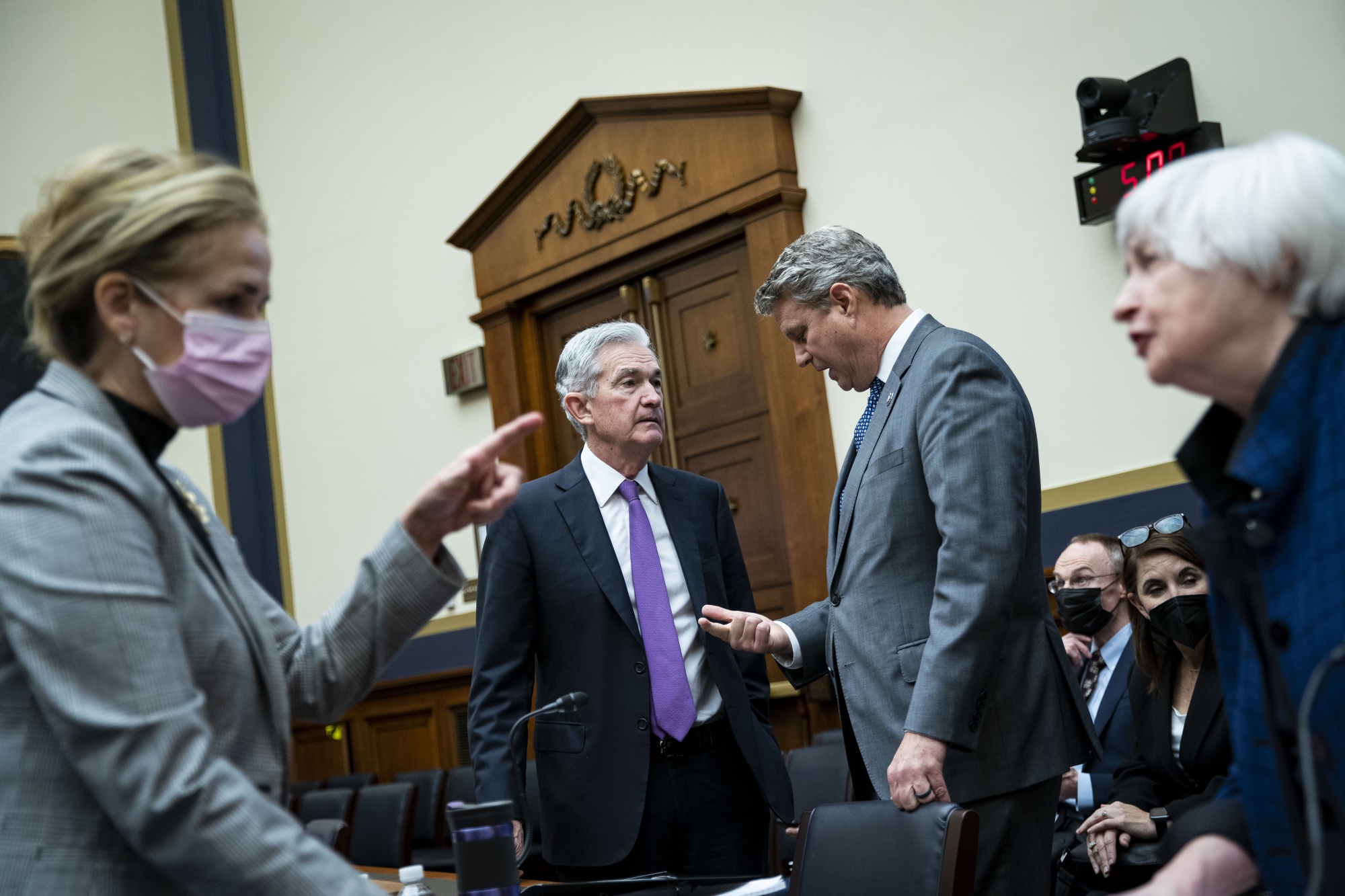 美联储主席杰罗姆·鲍威尔(Jerome Powell),左二,与来自密歇根州的共和党众议员比尔·哈辛加(Bill Huizenga)交谈,美国财政部长珍妮特·耶伦(Janet Yellen),右,与来自宾夕法尼亚州的民主党众议员玛德琳·迪恩(Madeleine Dean)交谈,这是在2021年12月1日星期三在华盛顿特区举行的众议院金融委员会听证会后的情景。美国股市在中央银行主席警告国会高通胀可能会导致提前结束资产购买计划后,周二下跌,短期利率上升,股票波动率指数激增。摄影师:Al Drago/Bloomberg欢迎来到《每周要闻》,这是一个主要担心在11月美国通胀数据公布前几个小时发布的新闻简报。我是跨资产记者凯蒂·格雷菲尔德(Katie Greifeld)。
