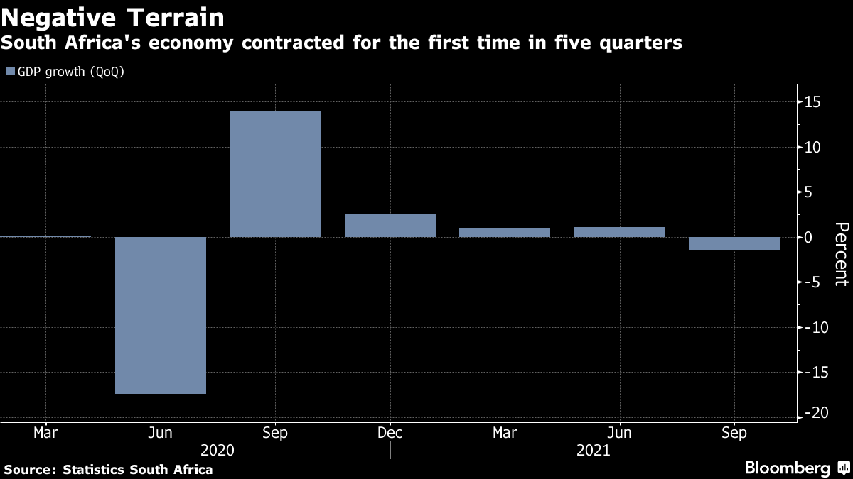 - 南非经济从近30年来最严重的萎缩中复苏在第三季度陷入停滞,在致命骚乱、更严格的封锁措施以及国有港口和铁路运营商遭受网络攻击之后减少了产出。