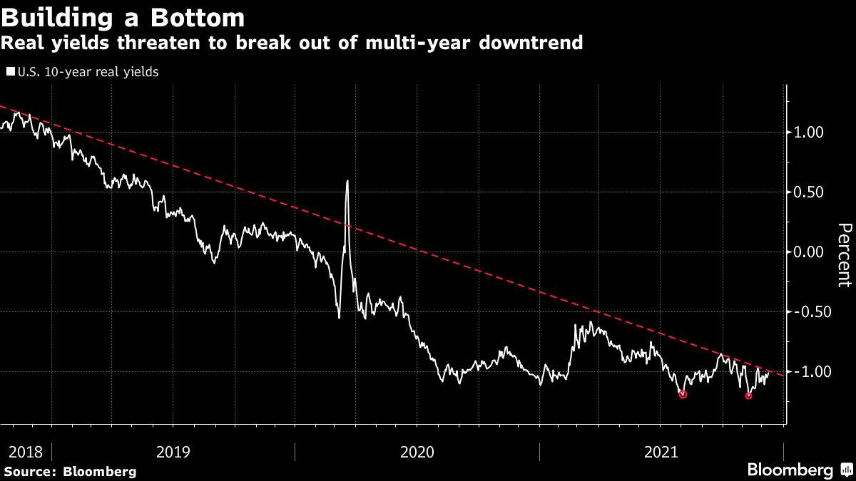 在本周美联储会议之前,股票多头应密切关注实际收益率,因为它们正威胁突破多年下降趋势。基准美国通胀调整后的收益率似乎已形成了一个双底模式,并正在测试自2018年以来一直保持的下降趋势,除了在2020年3月疫情恐慌高峰期间出现的短暂飙升。