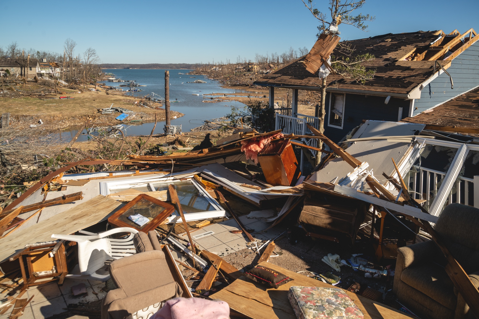 12月13日,一场龙卷风袭击了肯塔基州剑桥湖畔的一处受损房屋。