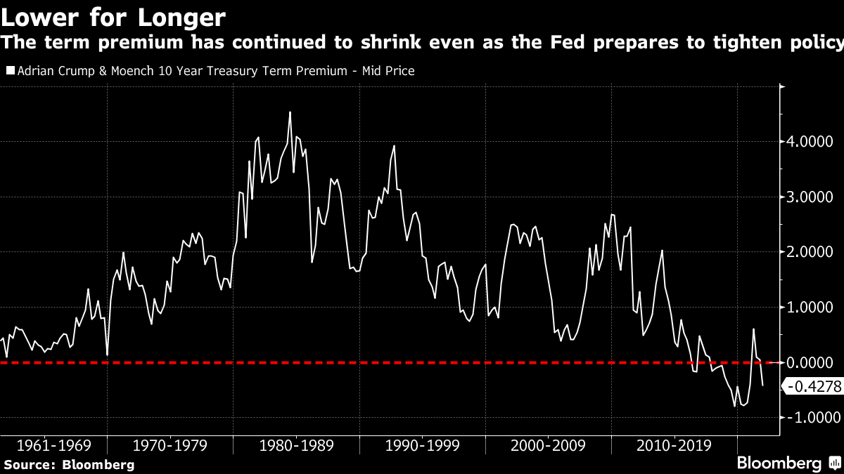 与此同时,期限溢价——或者投资者要求持有长期债务以换取额外补偿的部分——继续缩小。如果您认为债券投资者应该关注当前嵌入在货币政策和美国经济长期前景中的不确定性,这种现象就显得有些奇怪。(事实上,今年早些时候,期限溢价曾短暂转为正值,这是多年来的首次)。