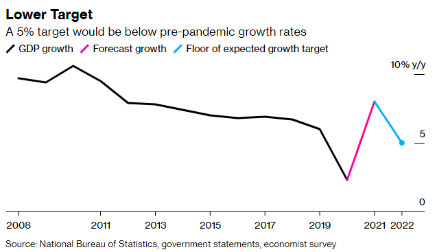 中国可能会在明年设定经济增长的底线为5%,因为它试图在一年关键的政治变革中平衡收紧房地产行业的愿望和稳定的需要。