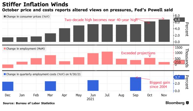 原因是?通胀现在是美联储的头号敌人,之前曾将其视为“短暂的”,更看重改善劳动力市场。鲍威尔表示,上涨的价格现在是恢复最大就业的“两大威胁”之一,另一个是疫情。