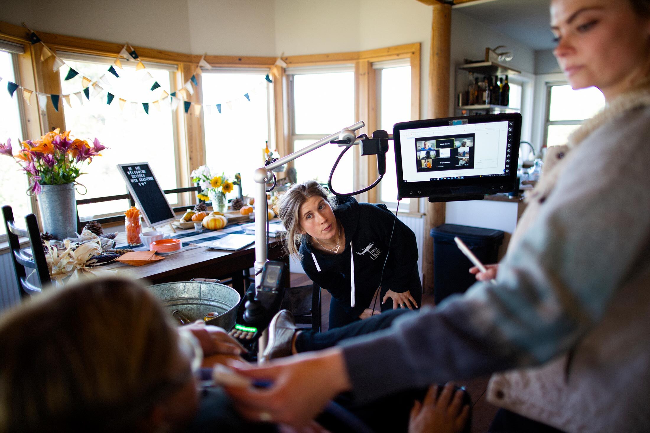 莫里斯在床上工作,得到她的助手凯瑟琳的帮助。摄影师:塔利亚·赫尔曼,为彭博商业周刊拍摄在我访问她位于加利福尼亚州山区小镇Sierraville的家的阴天十月日,一位名叫凯瑟琳的助手用热湿毛巾擦拭莫里斯的脸并刷她的牙齿。另一位名叫汉娜的助手给她丈夫发了一条短信,询问他晚上墨西哥外卖是想要鸡肉玉米卷还是卷饼。一台名为Tobii的人工智能电脑屏幕跟踪她眼球的注视来筛选她的电子邮件收件箱。一台呼吸机向她的鼻孔送气,以便她呼吸。当到了坐起来吃装有鳄梨酱玉米片和用吸管喝威士忌鸡尾酒的时候,她的三个成年子女进行了一场精心设计的舞蹈,将她无力的身体转移到一台电动轮椅上,她最小的儿子背着她的重量。
