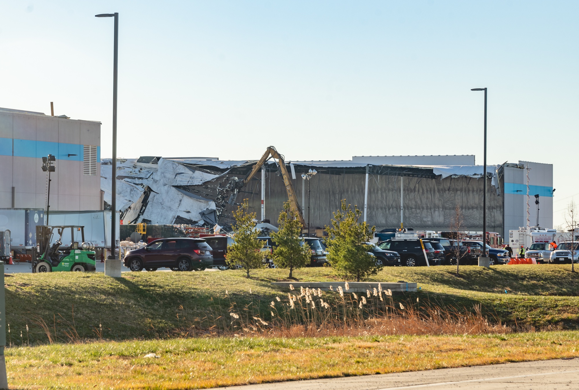 龙卷风摧毁了伊利诺伊州爱德华兹维尔的亚马逊仓库后,挖掘机正在清理残骸。