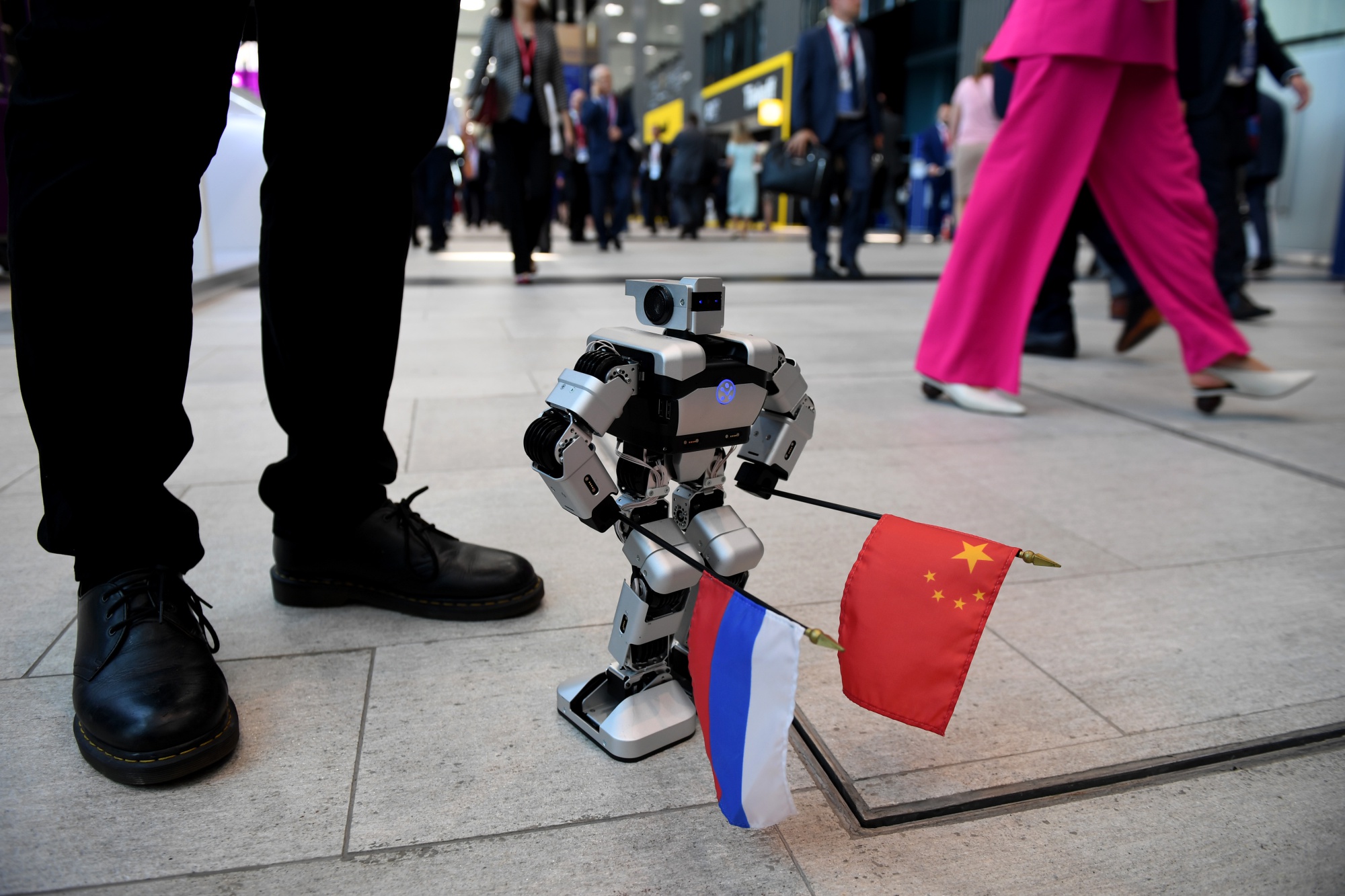 一架迷你机器人在2019年俄罗斯圣彼得堡国际经济论坛主会场内携带着俄罗斯和中国的国旗。