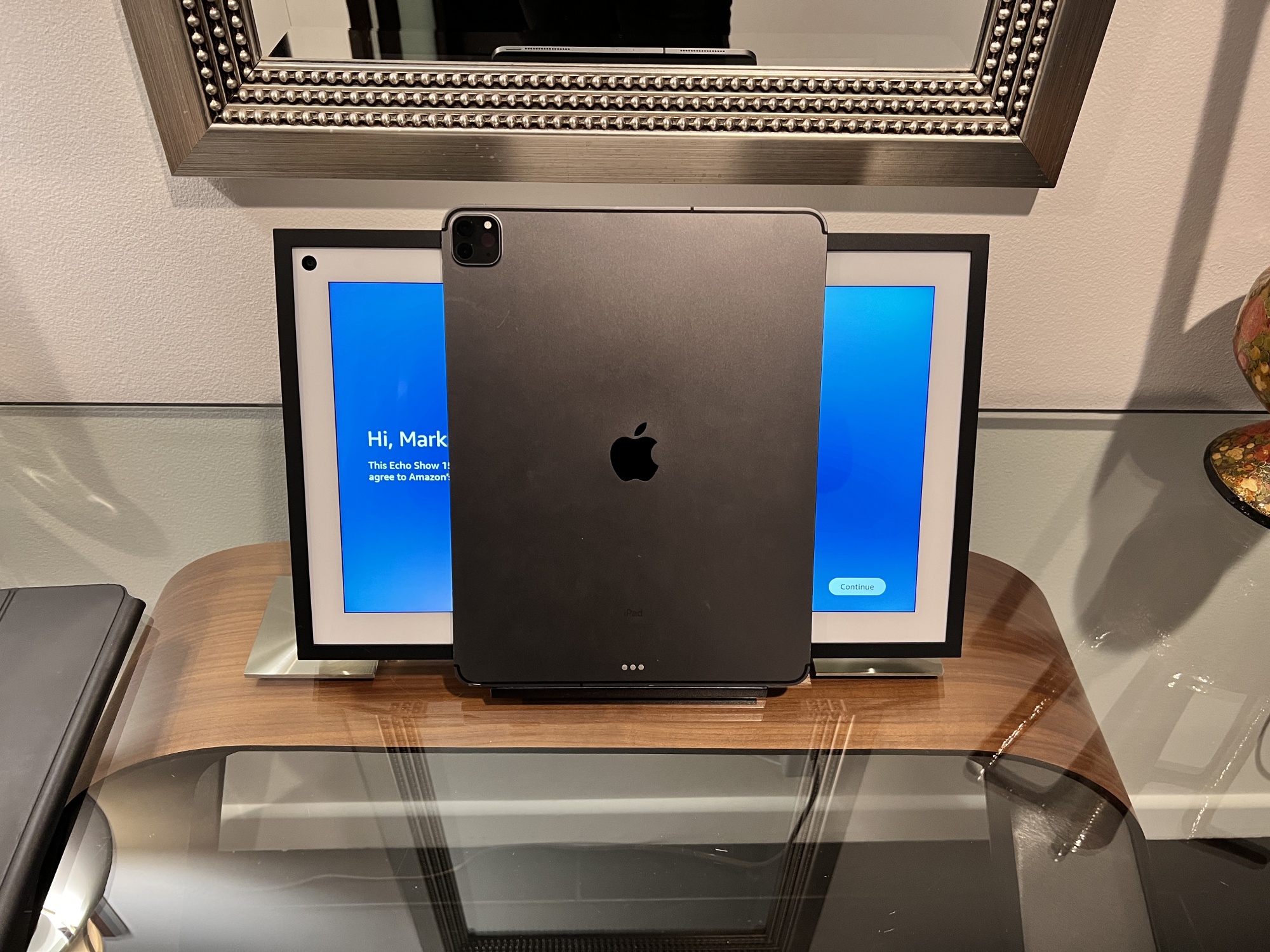 亚马逊Echo Show 15与12.9英寸iPad Pro进行比较。摄影师:Mark Gurman/Bloomberg但有两个主要的注意事项。