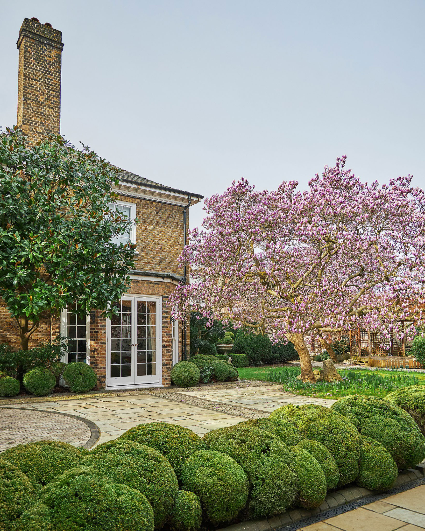 房子被一个大花园与马路隔开。摄影师:巴尼·亨德尔刚穿过门口,就是一个日式花园,里面有盛开的玉兰树、木制凉亭和一座鲤鱼池。一旦进入有围墙的院子,整个效果就像是一个乡村度假胜地,高墙挡住了街道的噪音。你绝对不会觉得自己只是离繁华的肯辛顿高街仅有10分钟步行路程,而是身处伦敦市中心的黄金地段。