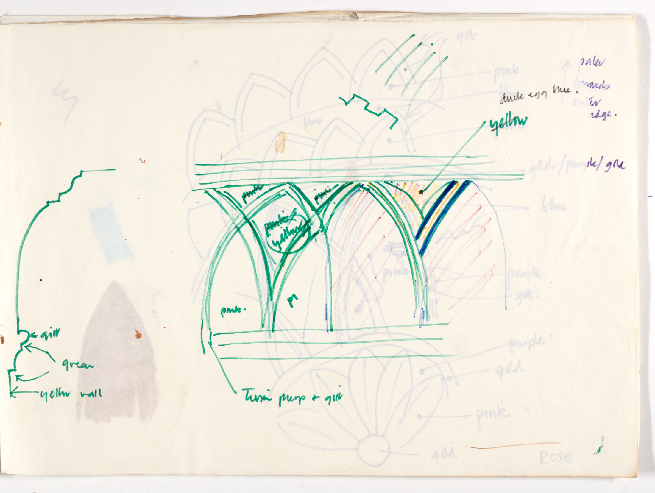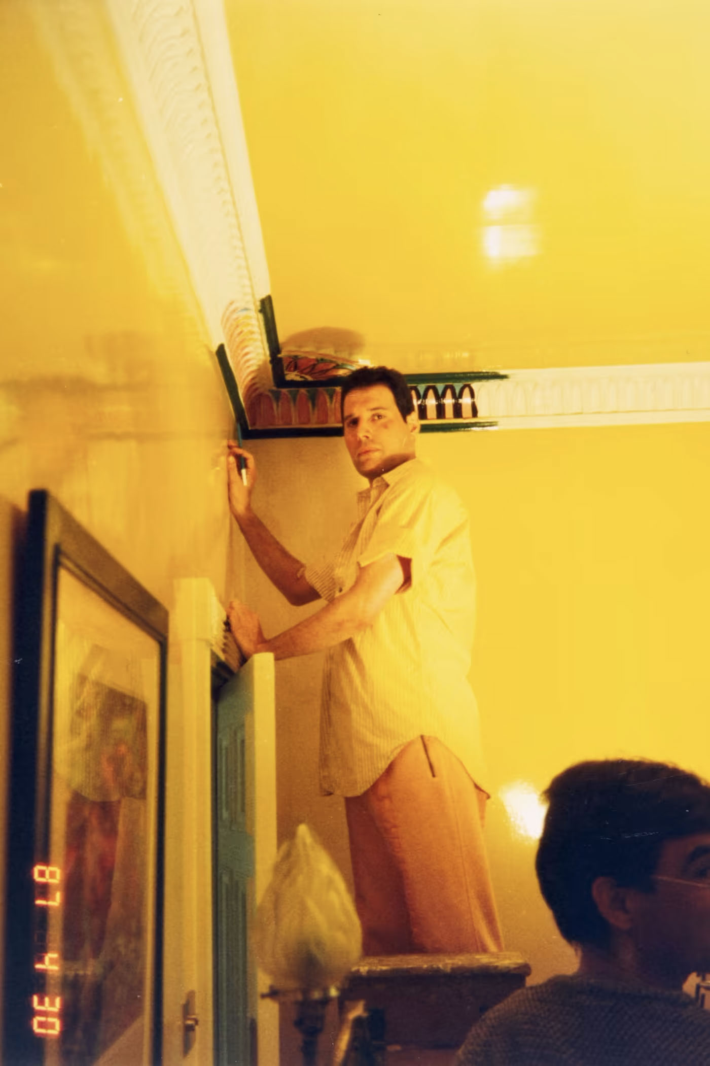 水星的餐厅设计,在上面的照片中你可以看到他在画。来源:Knight Frank“他找不到装饰者来实现他脑海中的想法,所以他不得不自己动手,”奥斯汀说,水星设计了一种粉色、绿色和黄色的墙壁。