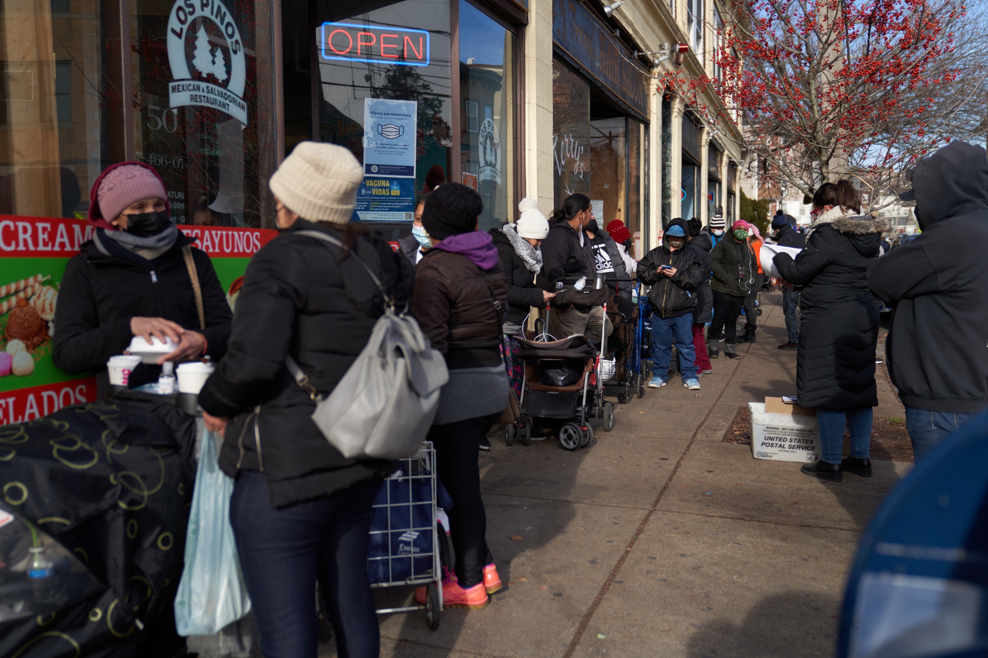 居民们在马萨诸塞州切尔西的一个食品分发点等待领取免费的新冠病毒家庭自测套装,日期为12月21日。