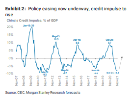 根据摩根士丹利的说法,中国经济预计将在2022年进入一个增长周期,政策制定者在经历政策导致的经济下滑后,从过度紧缩转向宽松。