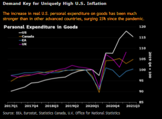 但彭博经济学首席美国经济学家安娜·王今天表明,需求也在推动价格上涨。事实上,与其他发达国家相比,尤其是强劲的商品需求可以通过美国过高的储蓄来解释,王说。