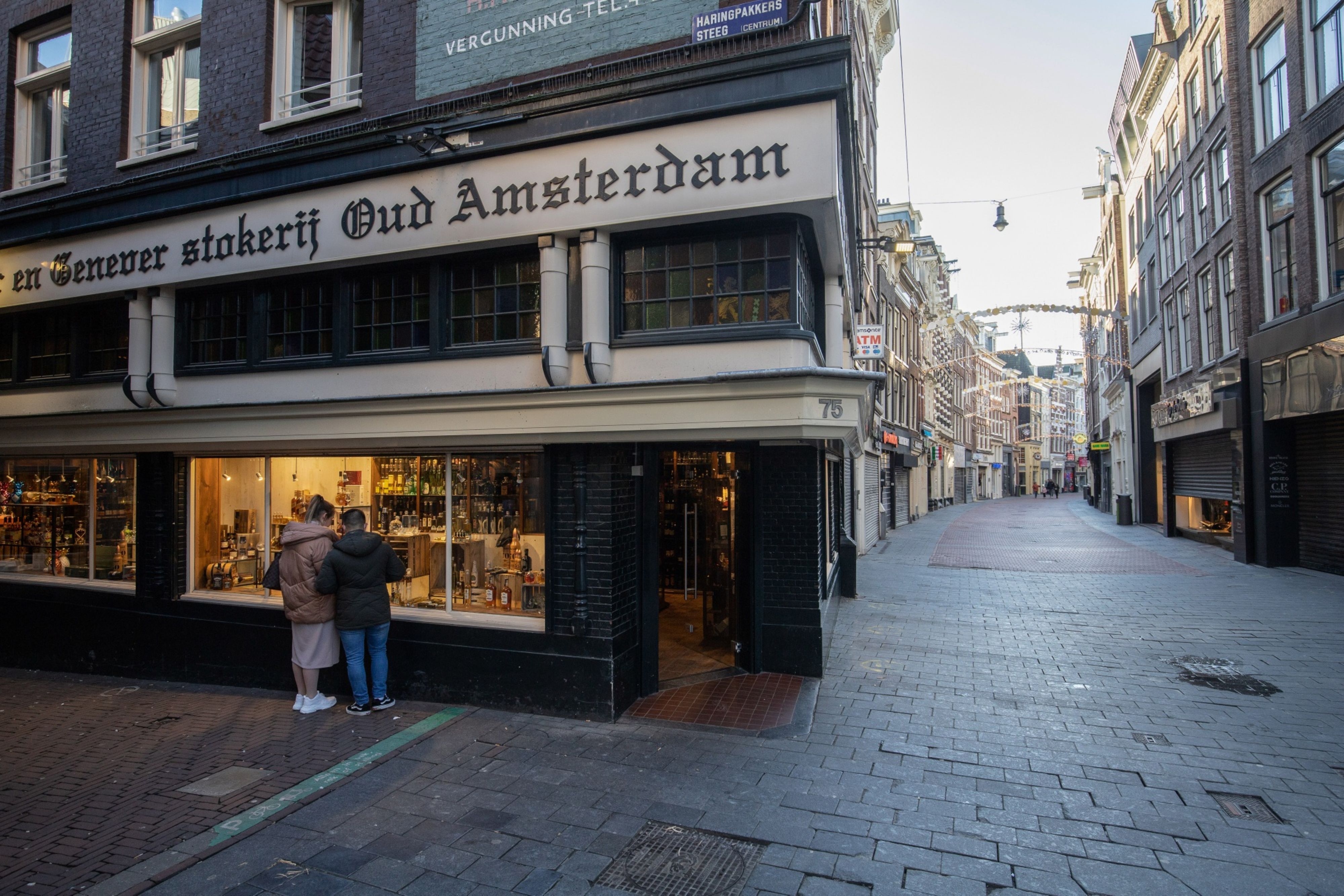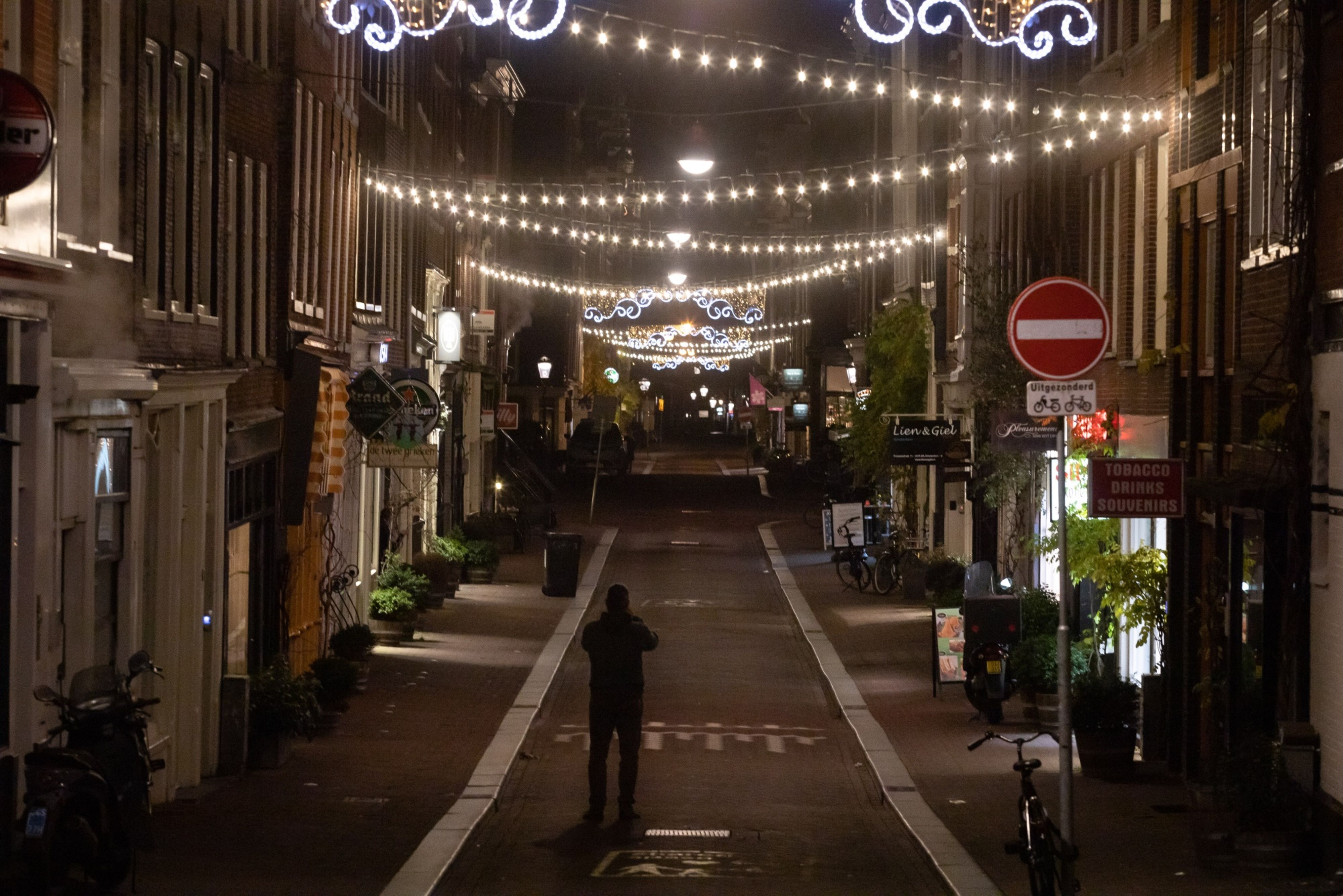 2021年12月21日,在阿姆斯特丹实施封锁措施期间,一条零售街上排满了关闭的企业。荷兰政府实施了更严格的封锁措施,以遏制由奥密克戎变种传播引起的冠状病毒感染激增。