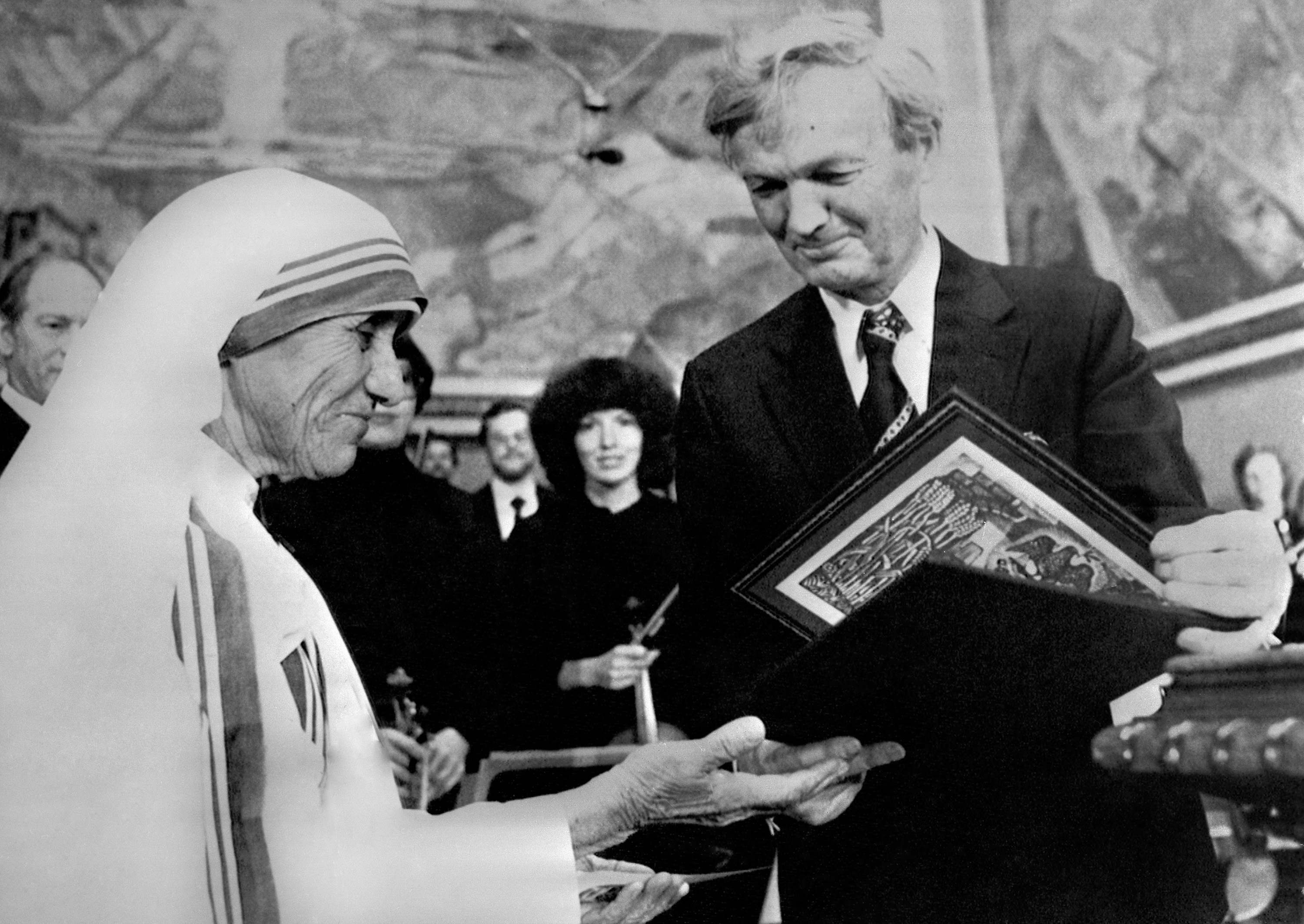1979年12月10日,特蕾莎修女在挪威奥斯陆获得诺贝尔和平奖。来源:彭博社### 明天你需要知道的事