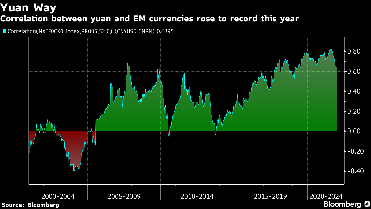 一连串超出预期的人民币汇率修正可能在周一结束,但中国货币的强势将继续引起新兴市场外汇交易员的关注,因为它在该市场的影响力日益增强。该货币与MSCI新兴市场同行指数的一年相关性今年创下纪录,正如我的同事们上周讨论的那样。尽管这种日益密切的关系在一定程度上是由于中国在该指数中的大权重,但也反映了中国与其他新兴市场之间联系日益加深。
