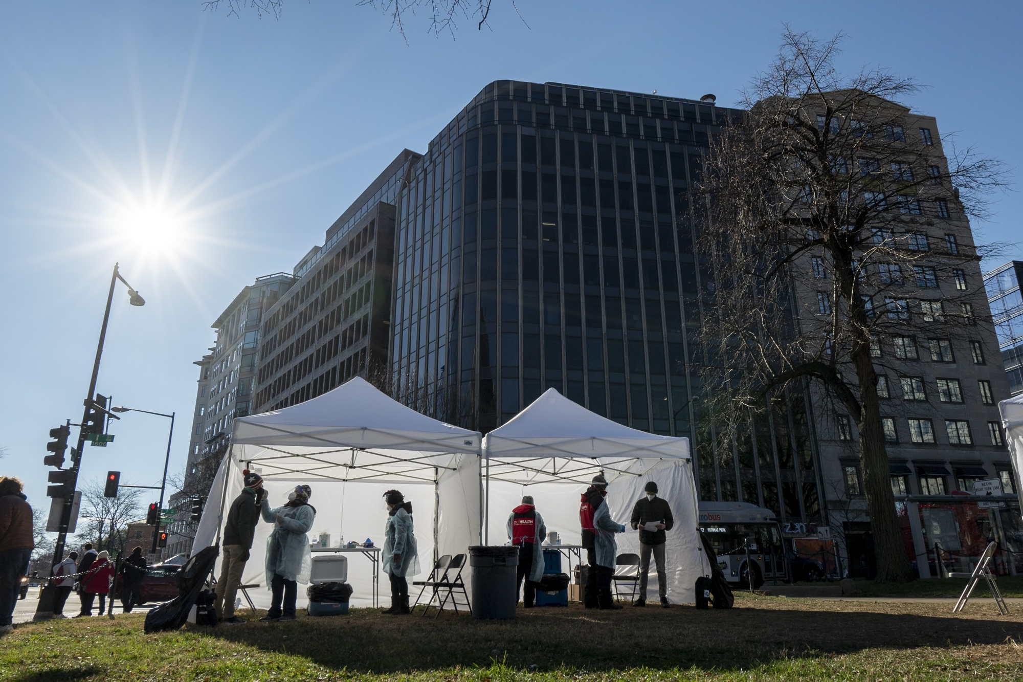 医护人员在华盛顿特区法拉格特广场的一个检测点进行新冠病毒检测。