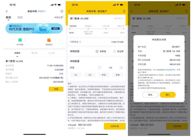 根据招股书显示,掌门教育拟以每股11至13美元的价格发行362.3万ADS(绿鞋前)。据老虎证券相关负责人介绍,目前掌门教育的打新通道已上线。投资者进入APP Tiger Trade的“新股申购”页面即可点击查看招股书并进行申购,最低申购数量为100股。按照当前的发行价区间计算,最低打新门槛为880美元。目前预计掌门教育将于6月8日上市,其申购通道将在6月7日晚19时关闭。