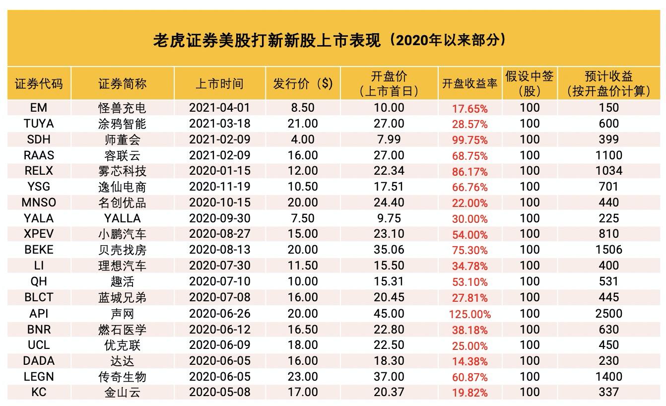 这些优质打新项目给投资者带来了真金白银的高收益。在老虎2020年提供的11支独家打新中,开盘涨幅即超过10%的就有7只,其中声网、传奇生物开盘涨幅分别为125%、60.87%,而声网首日最高涨幅更达179%,这对于日内交易者来说无疑是一笔可观的收益。而就中签率来说,相比当下A股、港股打新的一签难求,美股打新一般由券商自主分配,在老虎证券“普惠制+认购数量优先”的原则下,中签率相对高的多。据悉,今年的容联云、怪兽充电、知乎、涂鸦智能的上市项目中,老虎证券新股获配份额均领衔互联网券商。