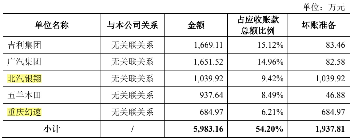 计提可能是状况之一。招股书提到,2018年,因北汽银翔和重庆幻速陷入债务危机,无力偿还其所欠公司的账款合计1724.89万元,公司对上述应收账款全额计提了坏账准备。