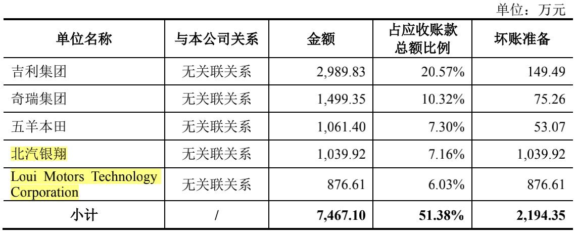 恒勃股份称,报告期各期末,除北汽银翔、重庆幻速与Loui Motors外,其余应收账款余额前五大客户均为公司销售收入前五大客户,公司与该等客户长期保持了良好的合作关系,发生坏账的风险较小。