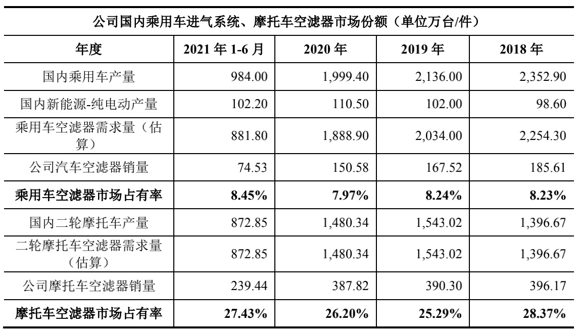 恒勃股份曾估算过乘用车空滤器的市场需求量,2018~2020年分别为2254.3万件、2034万件、1888.9万件,逐年下滑,2021年上半年只有881.8万件。