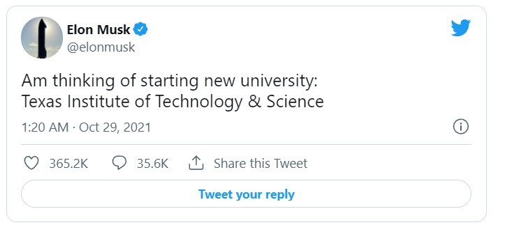 特斯拉首席执行官埃隆·马斯克(Elon Musk)周五在推特上表示,他正在考虑成立一所新的大学,名为“得州理工学院”(TITS)。