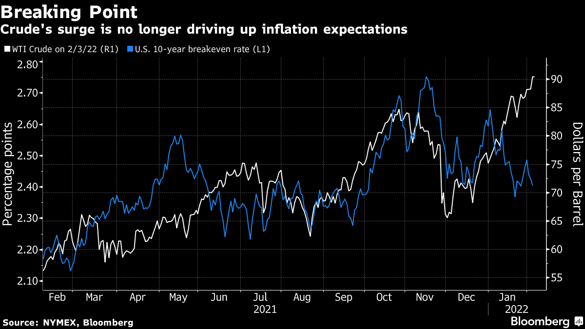 原油最初在10月份达到峰值,比ISM服务业采购经理人指数早了大约一个月,当时人们担心经济增长可能会动摇。最近的涨势部分是由于需求动态,但也受到地缘政治困扰和供应限制的影响。更大的担忧是市场对通胀预期与WTI脱钩。这告诉我们债券市场担心油价的上涨可能已经从强劲增长的迹象转变为潜在的强劲经济逆风。