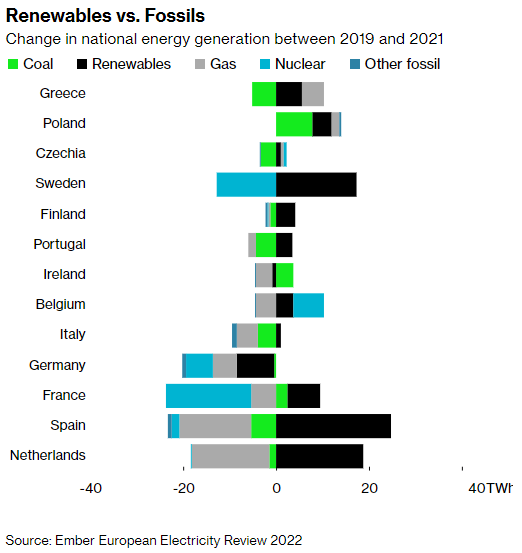 欧盟的可再生能源正在帮助减少其对天然气的依赖,而天然气的价格仍然让该地区付出巨大代价*。自去年年中以来,天然气价格飙升,给工业和消费者带来了冲击。根据总部位于伦敦的气候智库Ember的一项研究,自2019年以来超过一半的新可再生能源发电已经取代了天然气发电,其余主要取代了核能和煤炭能源。*