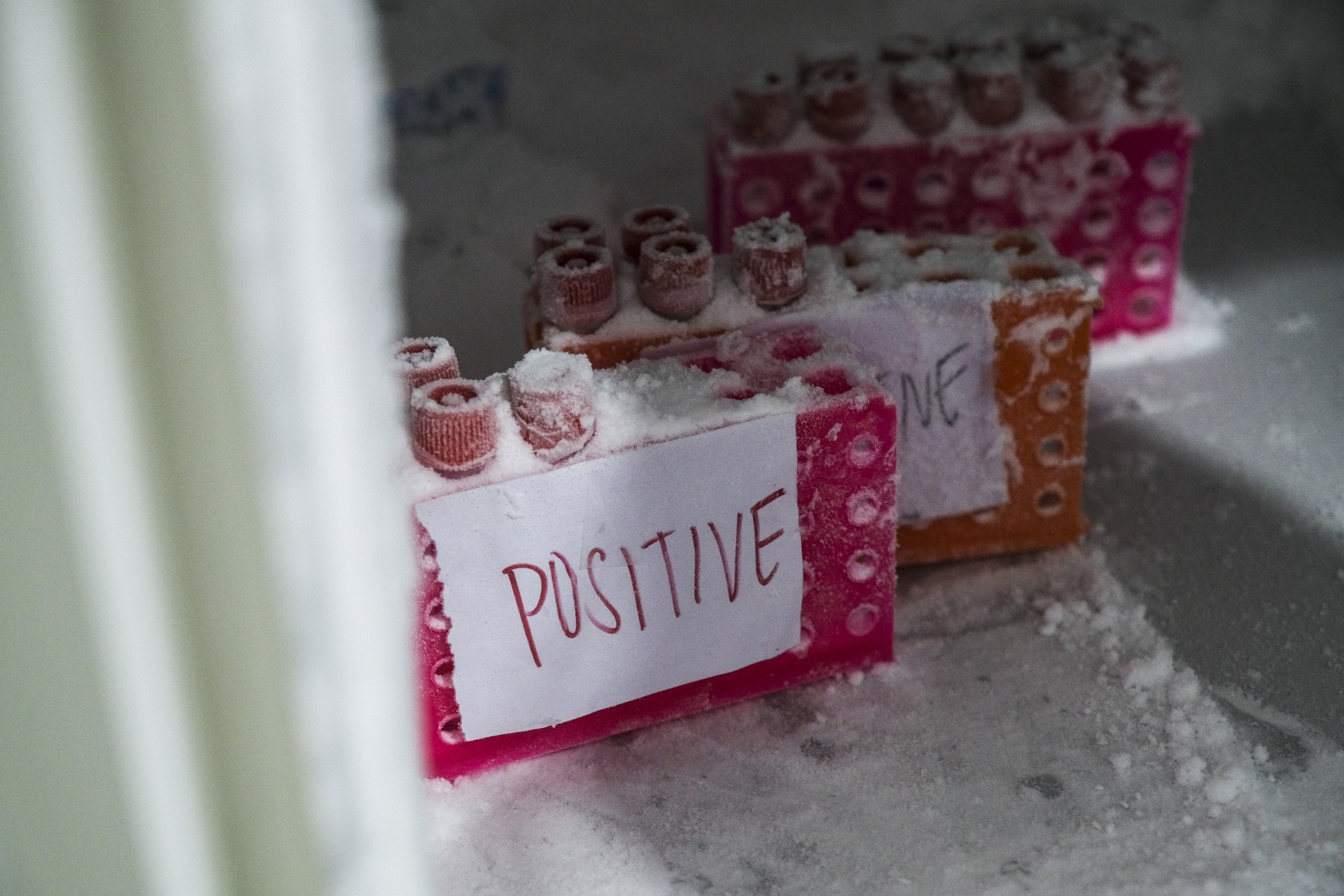 在实验室的冰箱里,存放着用于处理新冠病毒RT-PCR检测的阳性样本。