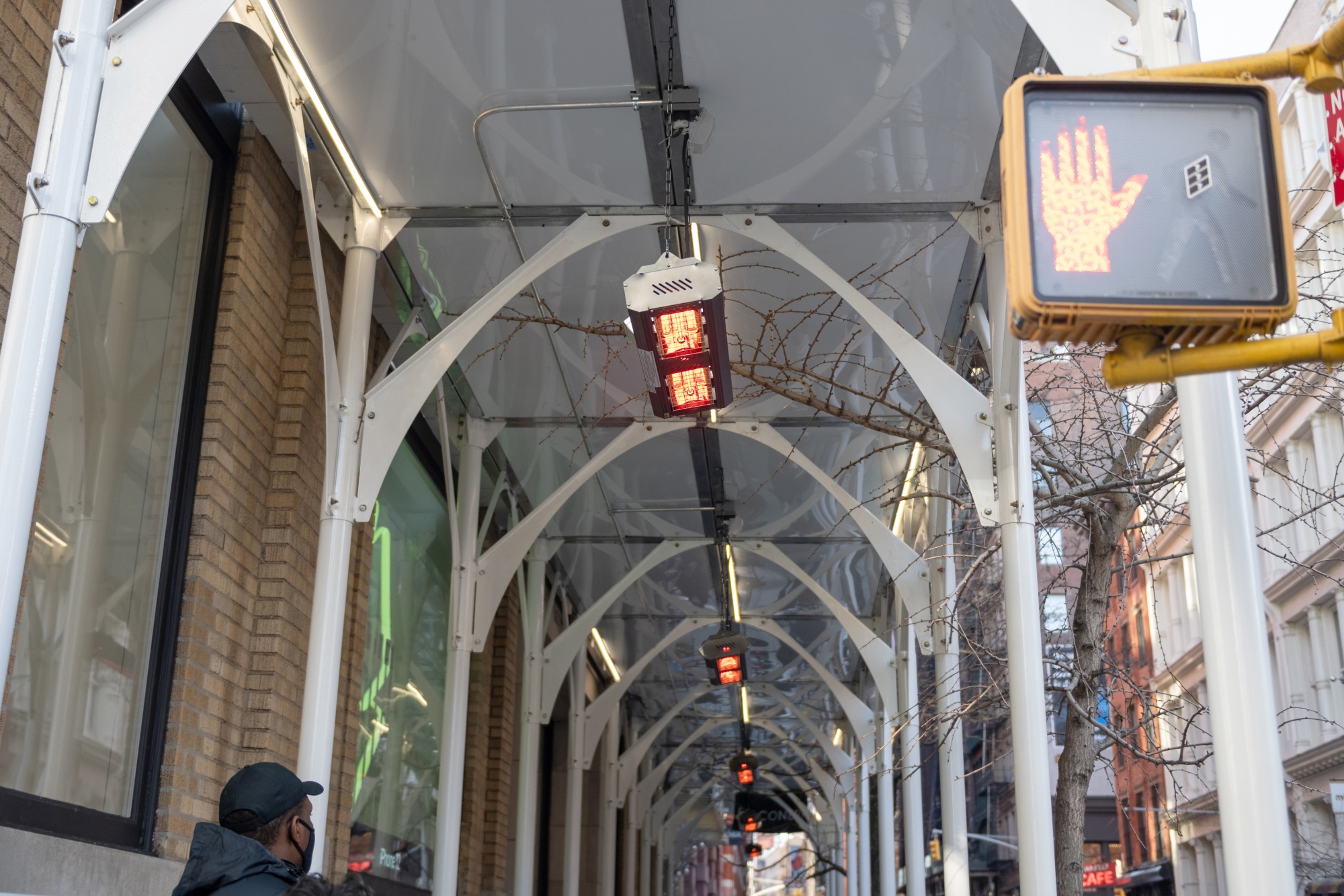 Urban Umbrella脚手架没有交叉支撑,而是由纤细的钢柱支撑,顶部靠拱形支撑 —— 它是明亮的白色,而不是法律规定的其他每个棚子都必须采用的猎人绿色。该公司获得了纽约市颜色协调法规的官方豁免,2013年首次颁布,当时市长迈克尔·布隆伯格颁布。(布隆伯格拥有布隆伯格城市实验室的母公司布隆伯格LP。)一些配备LED灯、加热器,播放顺畅爵士音乐的扬声器,以及透明亚克力屋顶,让行人看到天空。该公司还改进了设计,用作餐厅用餐棚,以保护疫情时代的露天用餐者免受自然影响。