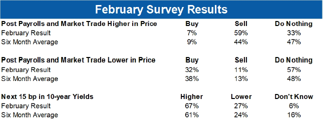 根据至少一个样本,债券交易员有一个计划。BMO Capital Markets的非正式NFP调查发现,59%的受访者将在任何发布工资单后的国债强势时抛售--这是自2009年4月以来的最高比例,与44%的平均水平相比。与此同时,仅有32%的人会在债券下跌时买入,而正常情况下为38%。