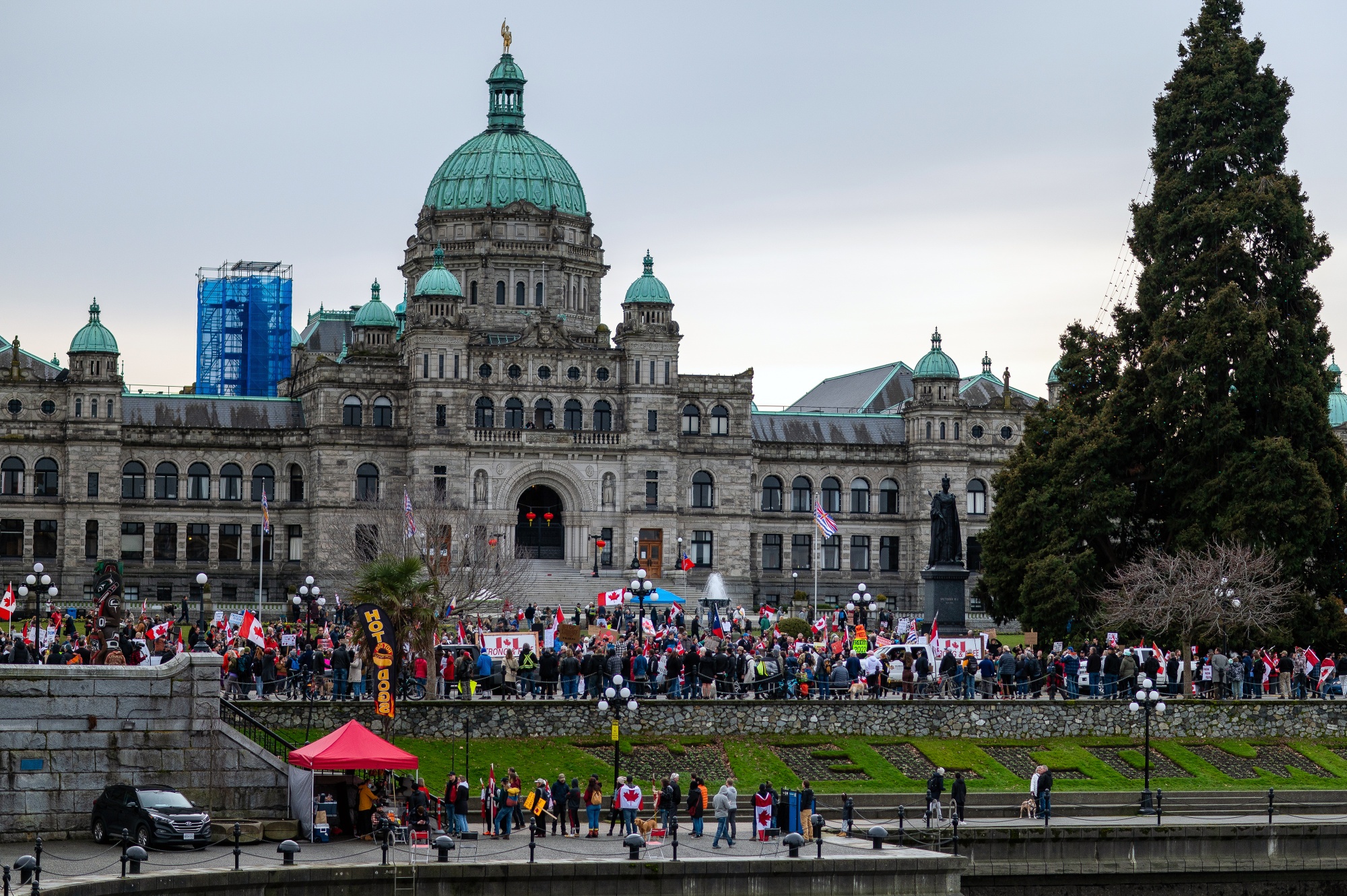 抗议者在2022年2月5日加拿大维多利亚的不列颠哥伦比亚省立法会大厦外集会。