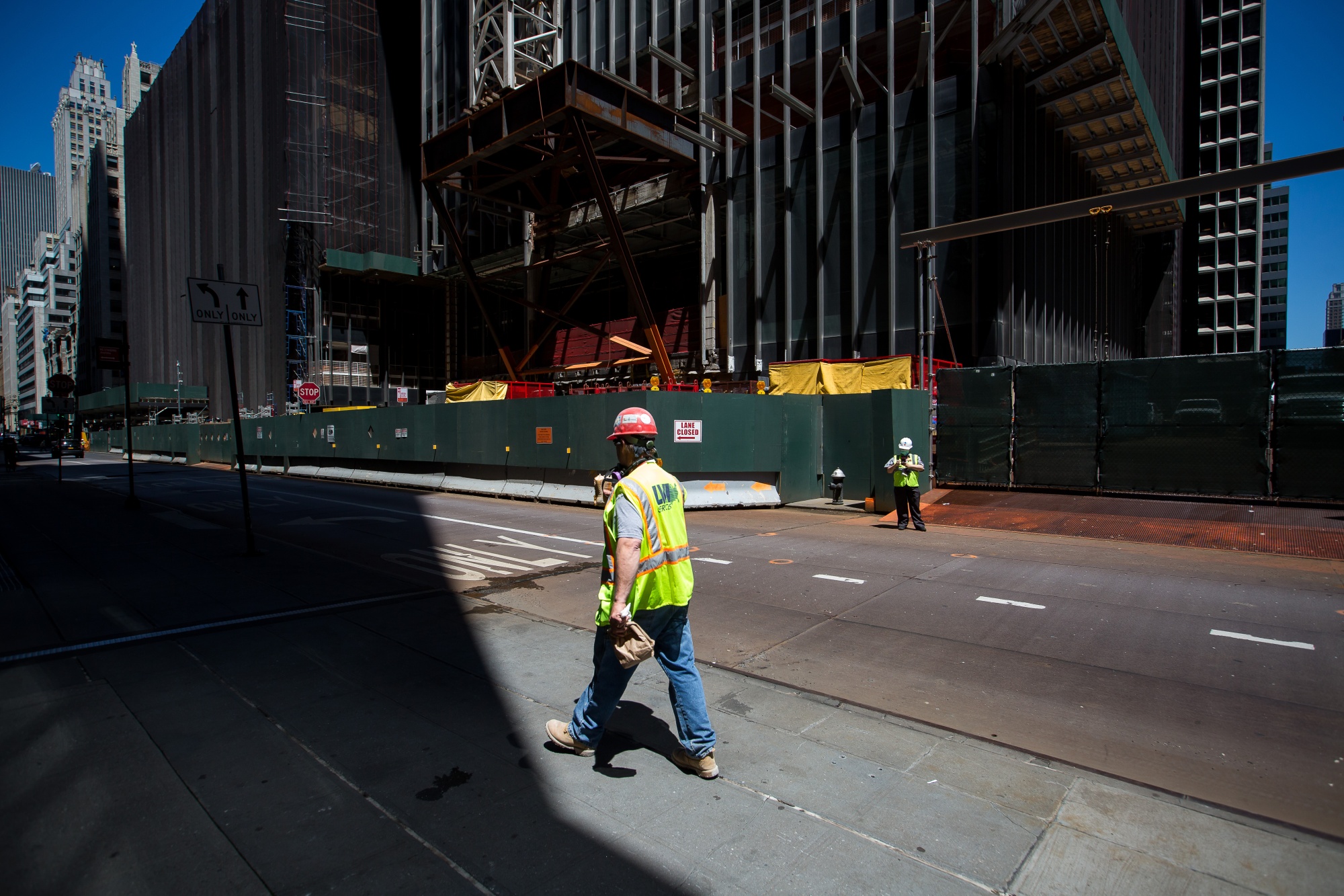 一名工人在2020年6月走过摩根大通公司总部的施工现场。摄影师:Michael Nagle/Bloomberg从同一街区开始,一直延伸到第57街,大中央计划更新其火车棚——实质上是一个位于帕克大道正下方的地下铁路场地。火车棚的翻新可能需要数十年的时间,并且在某个时候将干扰到这11个街区范围内的每一个购物中心。纽约市交通局计划从摩根大通前面的购物中心开始进行景观重新设计,因为这将是第一个被拆除的。