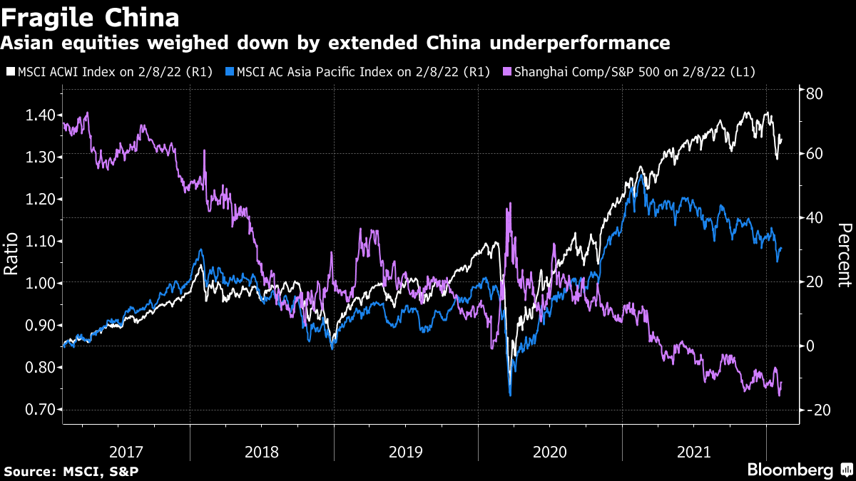 这是一种在大流行病和其引发的货币刺激之前就存在的趋势。潜在的驱动因素有很多。中国成熟的增长模式和人口下降趋势,前总统唐纳德·特朗普发起的贸易战,以及习近平主席普惠共享计划中更加威权主义的转变,所有这些都可能发挥了作用。这种趋势的持续也现在正成为亚洲股市更广泛的一个负担。在过去一年中,无论是好时光还是坏时光,它们都在全球股市中表现不佳,在摆脱早期中国弱势后,在Covid-19爆发前的几年里表现出色。