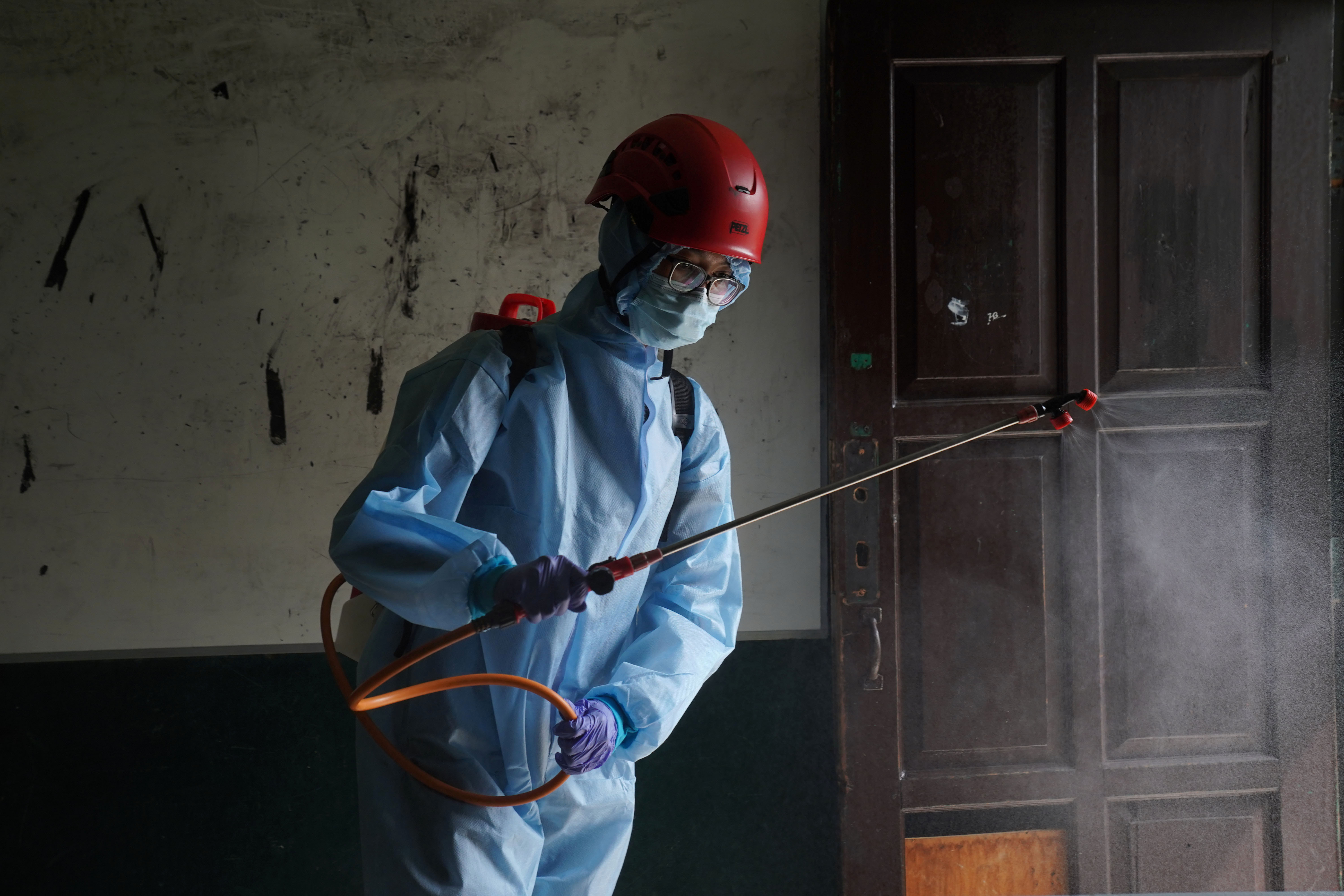 印度尼西亚红十字会(IFRC)的一名成员在2月4日在雅加达一所高中的教室内喷洒消毒剂。