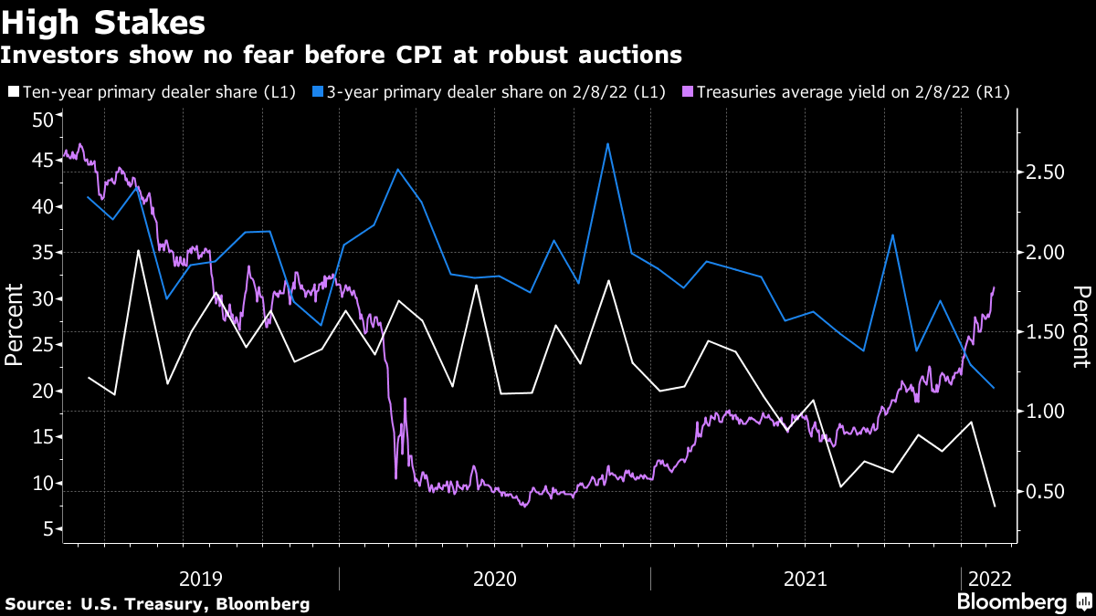 过去两天极为强劲的国债销售表明,尽管美国CPI报告将于周四在美国时段公布,但仍有许多投资者愿意涌入曲线的短端和长端。预计该报告将显示一月份的年度通胀率超过了已经是自1982年以来最高的12月份的7%。然而,周二的三年期和周三的十年期发行均见证了创纪录的低主要交易商参与度,因为投资者纷纷涌入。是什么原因呢?
