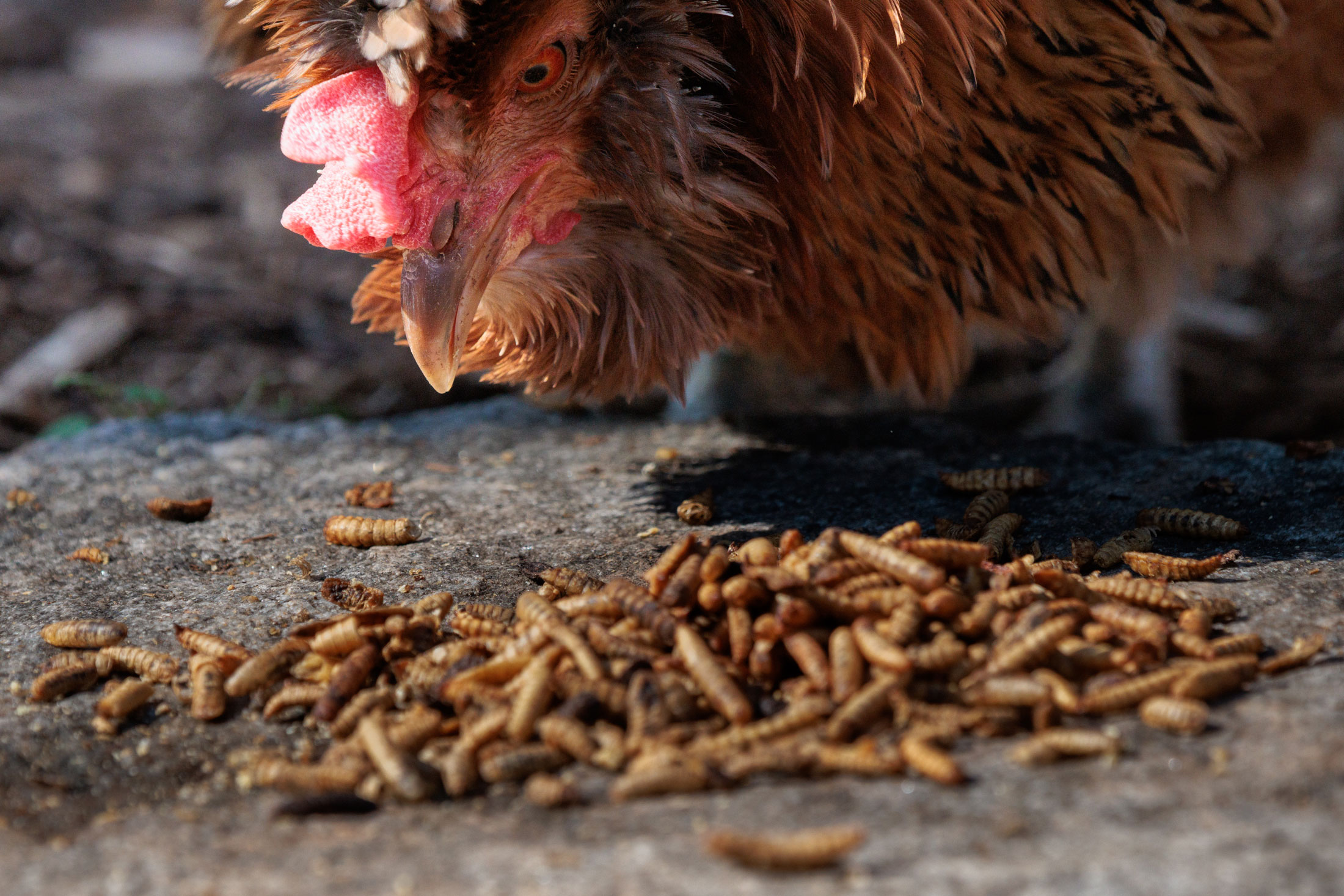 一只鸡正在吃格鲁比农场烘干的黑蝇幼虫,一种可持续的蛋白质。