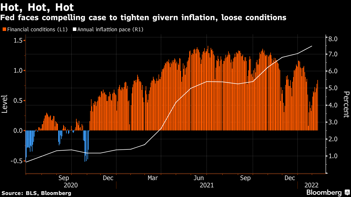 当然,市场痛苦的一个关键原因是,市场预计美联储将比预期更快、更进一步地加息 —— 交易员认为下个月加息50个基点的可能性超过80%,并且非常有把握地认为央行在年底前会将其基准利率提高1.75个百分点。这将是自2005年以来加息速度最快的一次。如果这听起来像是过度反应,那么当你看到仍然非常宽松的金融条件和通胀飙升时,就会有充分的理由支持这一观点。这为美联储需要采取行动并有空间这一观点提供了有力的论据。