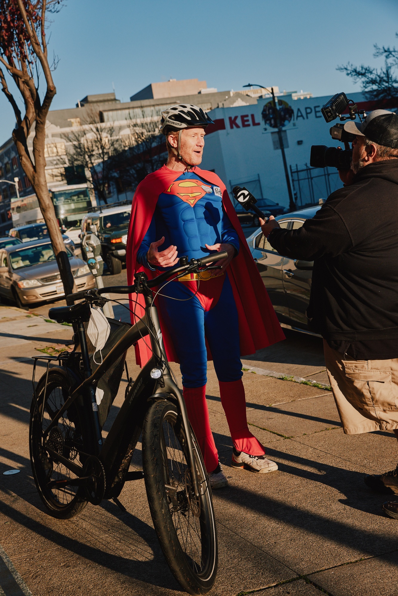 摄影师:Bryan Banducci/Bloomberg一个穿着超人服装的男子和一个骑着经过装饰的三轮车的孩子,被亲切地称为“trek-ceratops”,在一群骑自行车的人群中脱颖而出,他们正沿着旧金山的JFK大道中间骑行去上学。