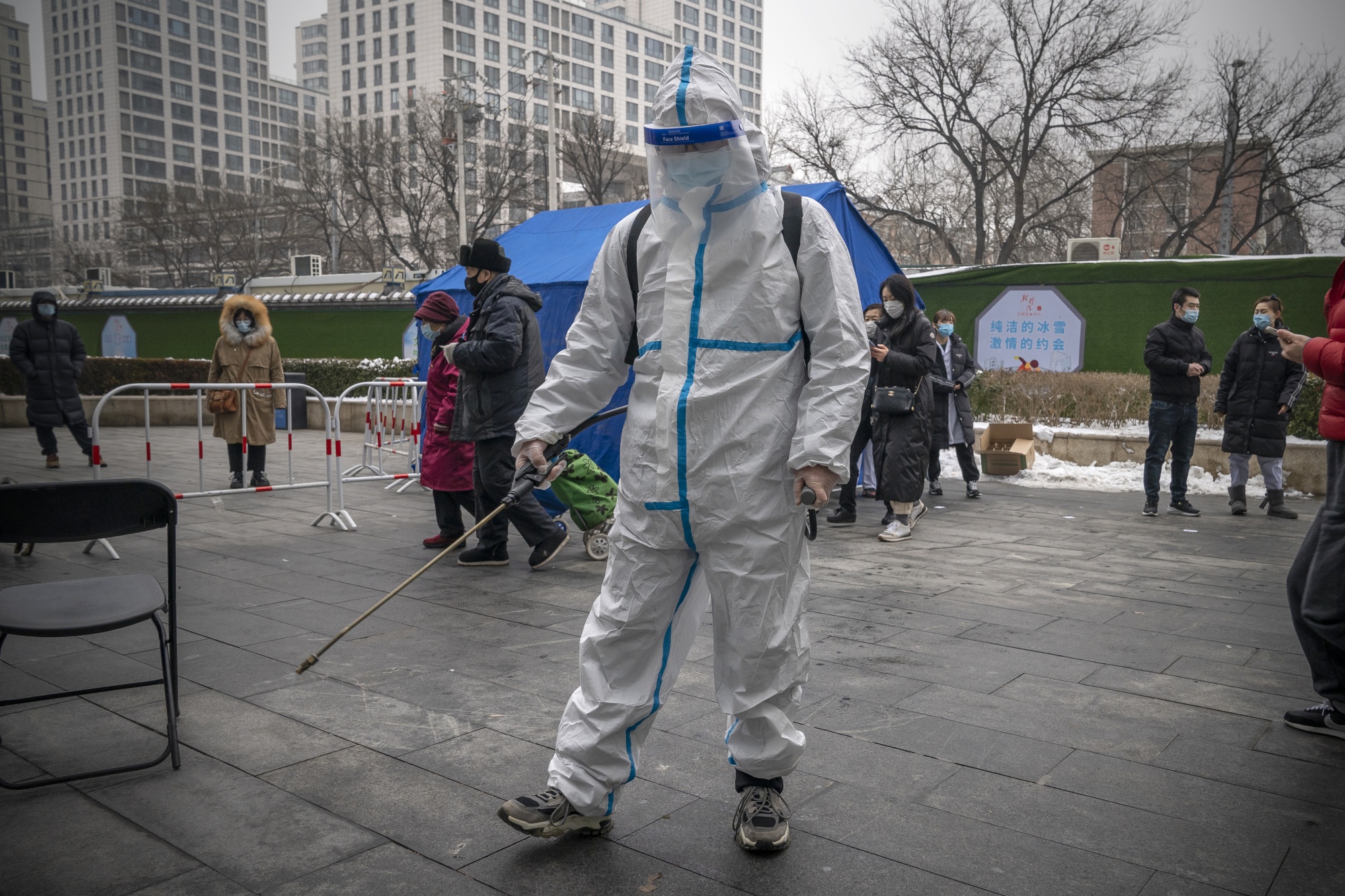 一名卫生工作者在北京对一处新冠病毒检测点进行消毒。摄影师:Andrea Verdelli/Bloomberg### 你应该阅读的内容
